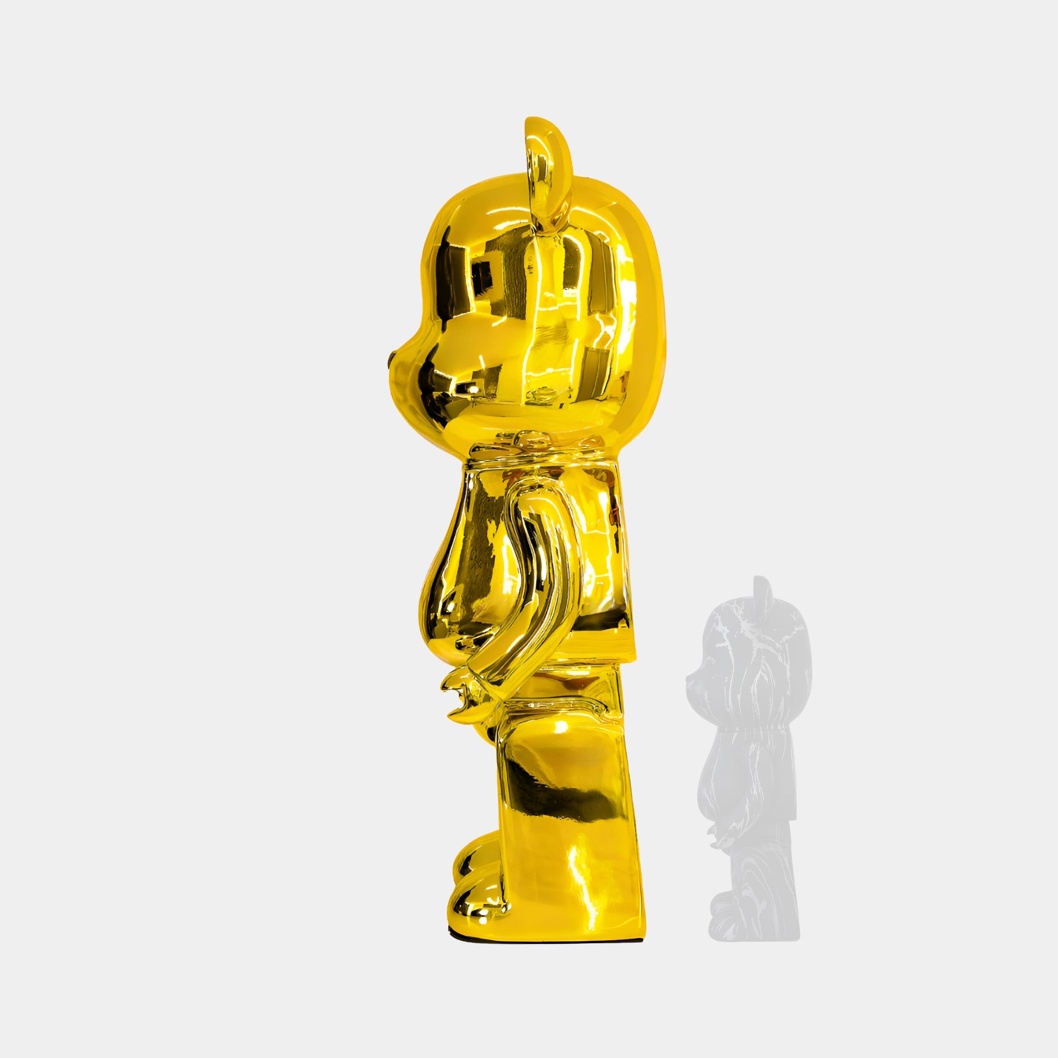 Ideal for upscale homes, executive offices, or galleries, this sculpture elevates your space with its luxurious aesthetic. The gleaming gilded gold finish interacts beautifully with ambient light, adding warmth and richness to your decor. Its impressive size and contemporary design make it a versatile addition to various interior styles, from minimalist to lavish. This piece not only enhances the visual appeal of your environment but also serves as a conversation starter, embodying elegance, luxury, and artistic sophistication.