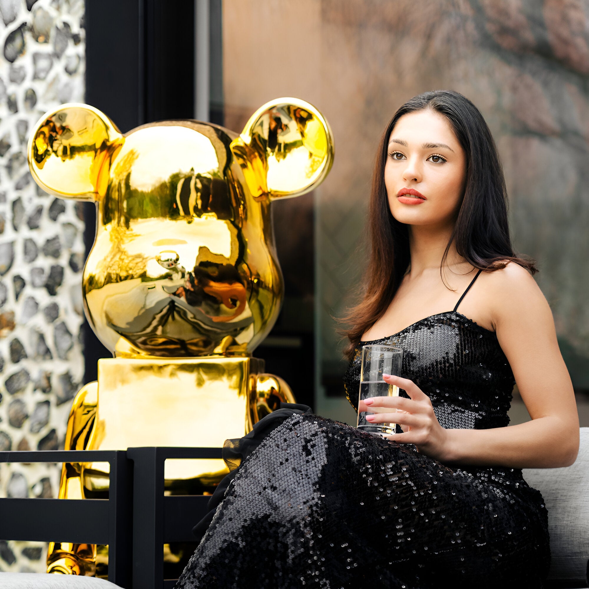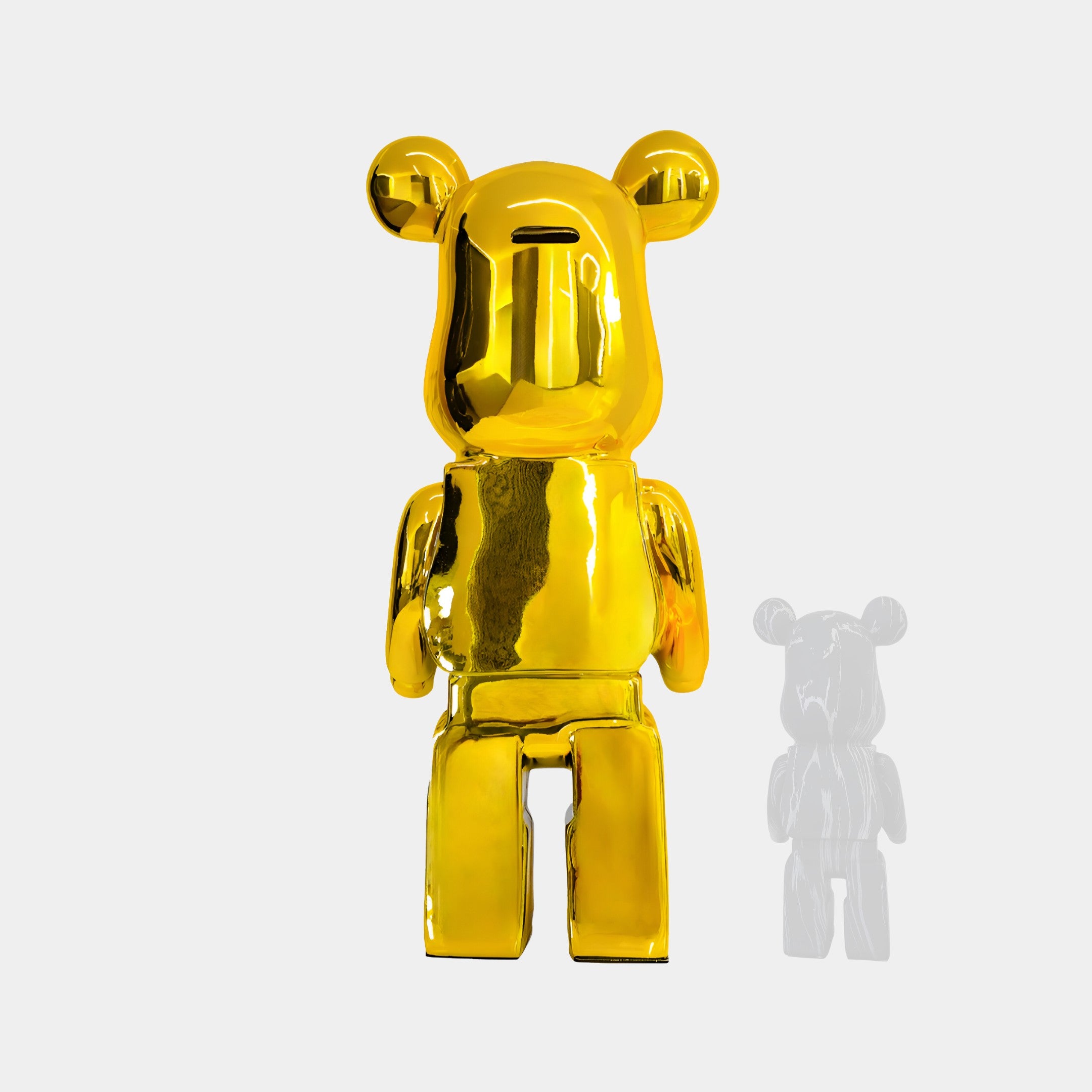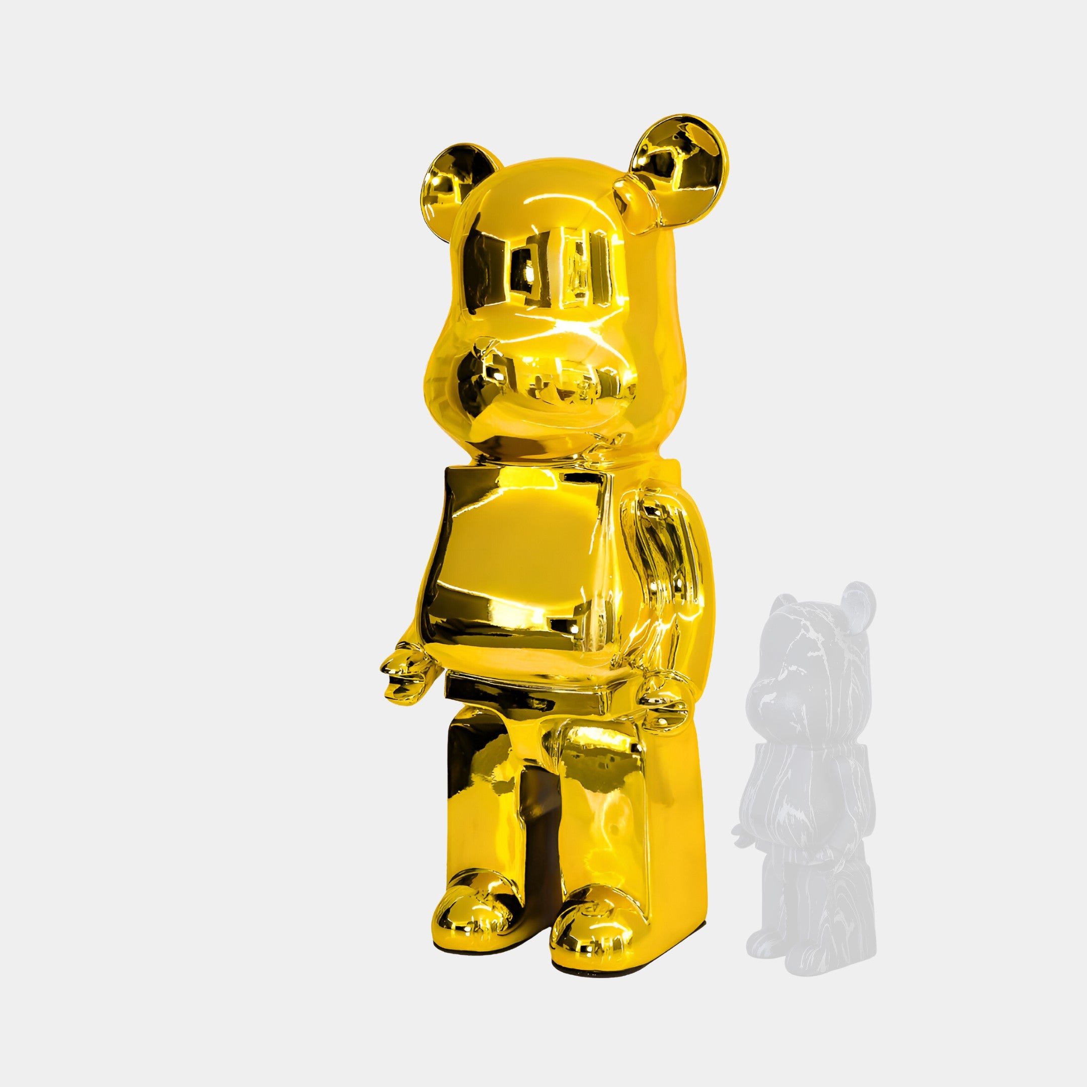 Presenting an exceptional work of contemporary art, this 135cm gilded gold bear sculpture exudes elegance and luxury. Meticulously crafted from premium resin, the piece showcases a stylized bear with geometric facets, combining smooth contours and sharp angles for a visually dynamic effect. The electroplated gilded gold finish imparts a radiant, mirror-like sheen that enhances the opulent gold hue, making the sculpture a captivating centerpiece in any sophisticated interior. The intricate craftsmanship and high-quality materials reflect a refined appreciation for modern artistry.
