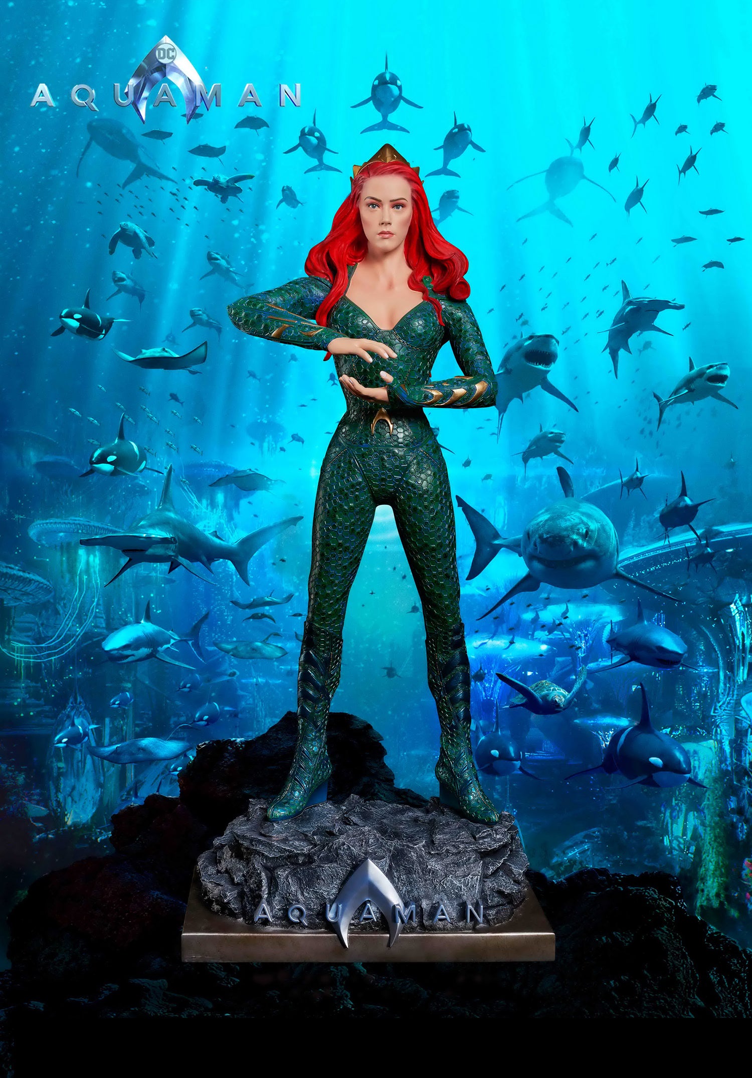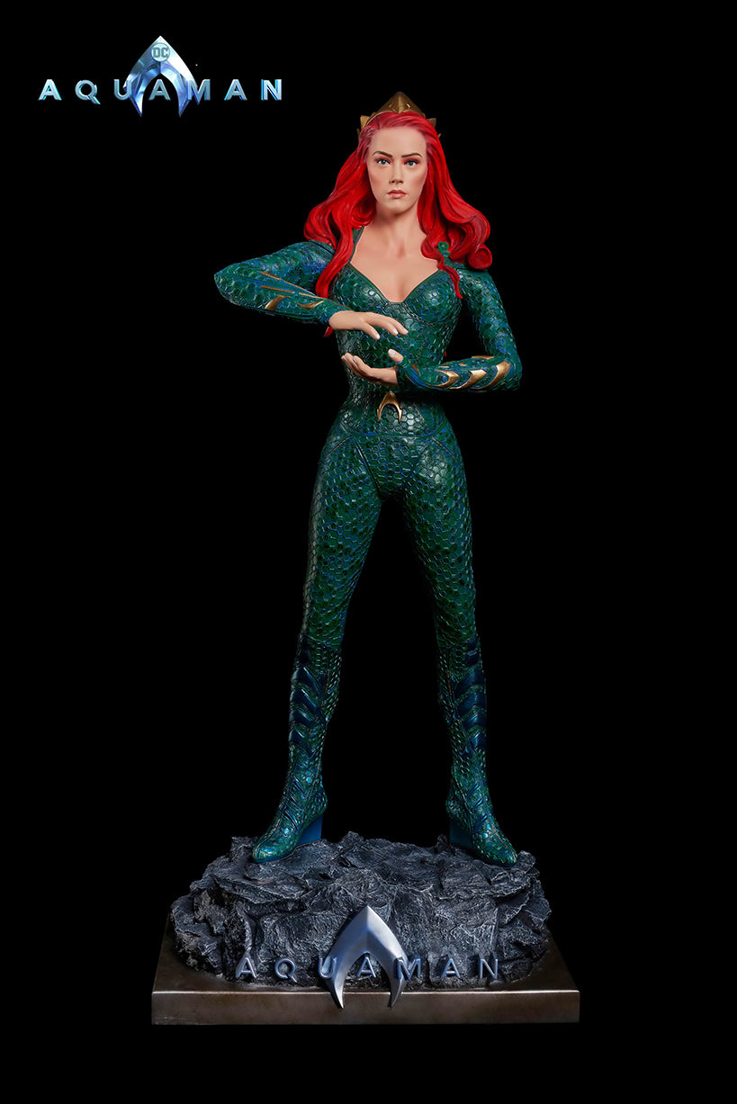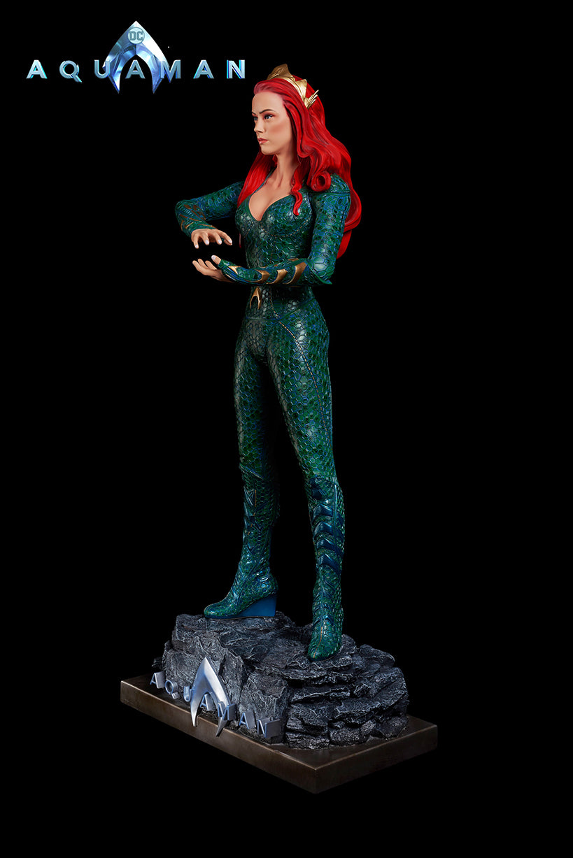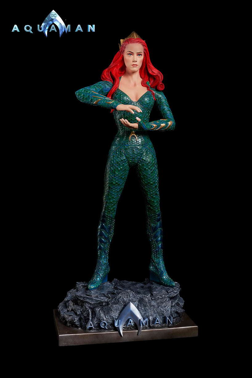 From James Wan's smash success, comes the Queen of Atlantis, Mera, who fights alongside her soulmate, the Atlantian King, Aquaman. Mera is featured in her aquatic suit, featuring her unique octagonal patterns?and is?standing on a custom base which includes the DC film's logo.