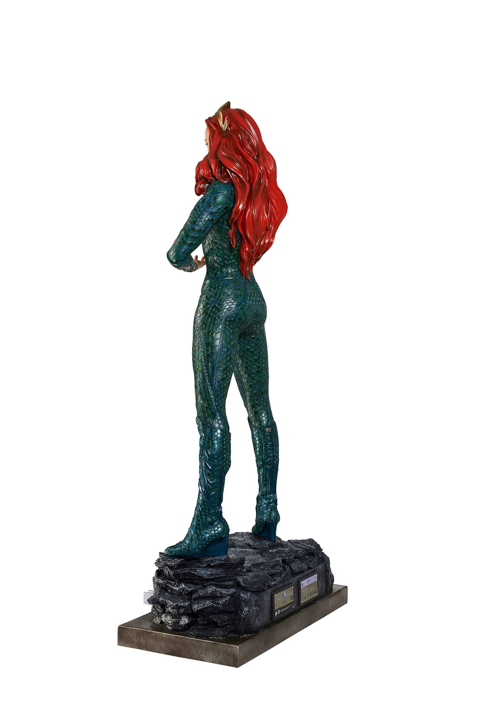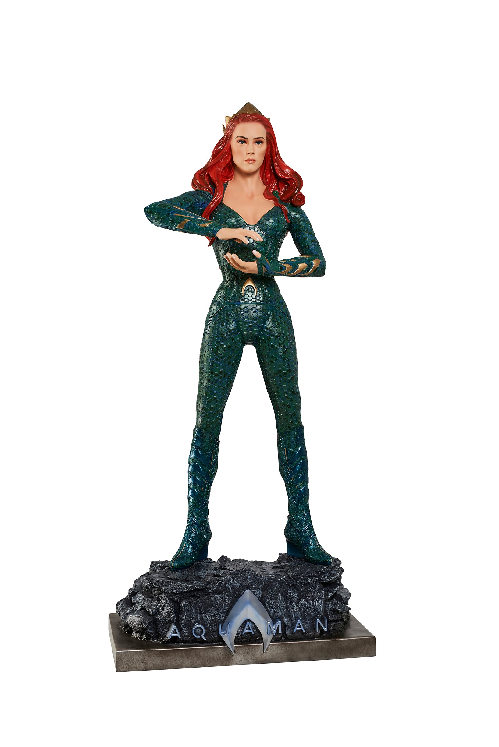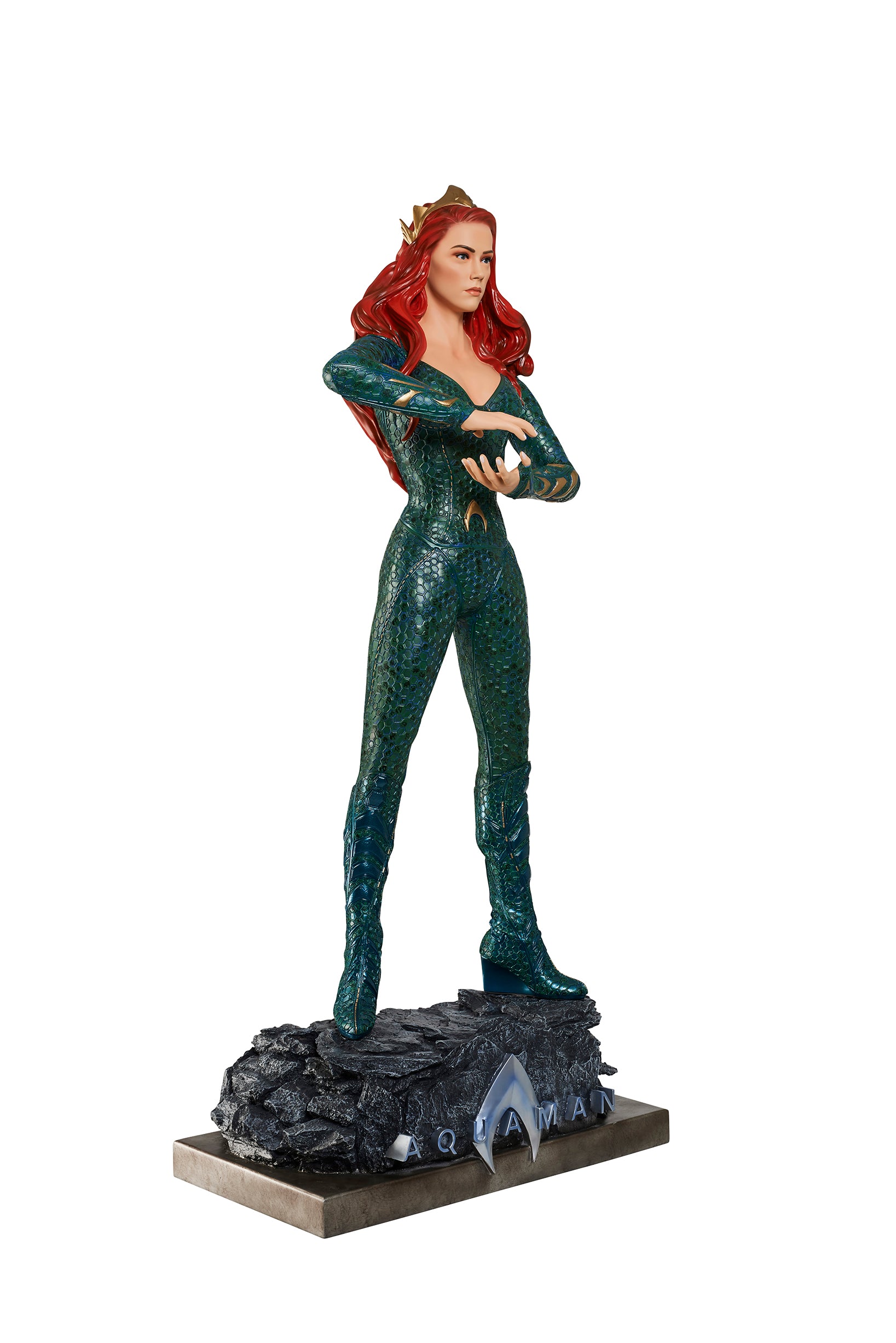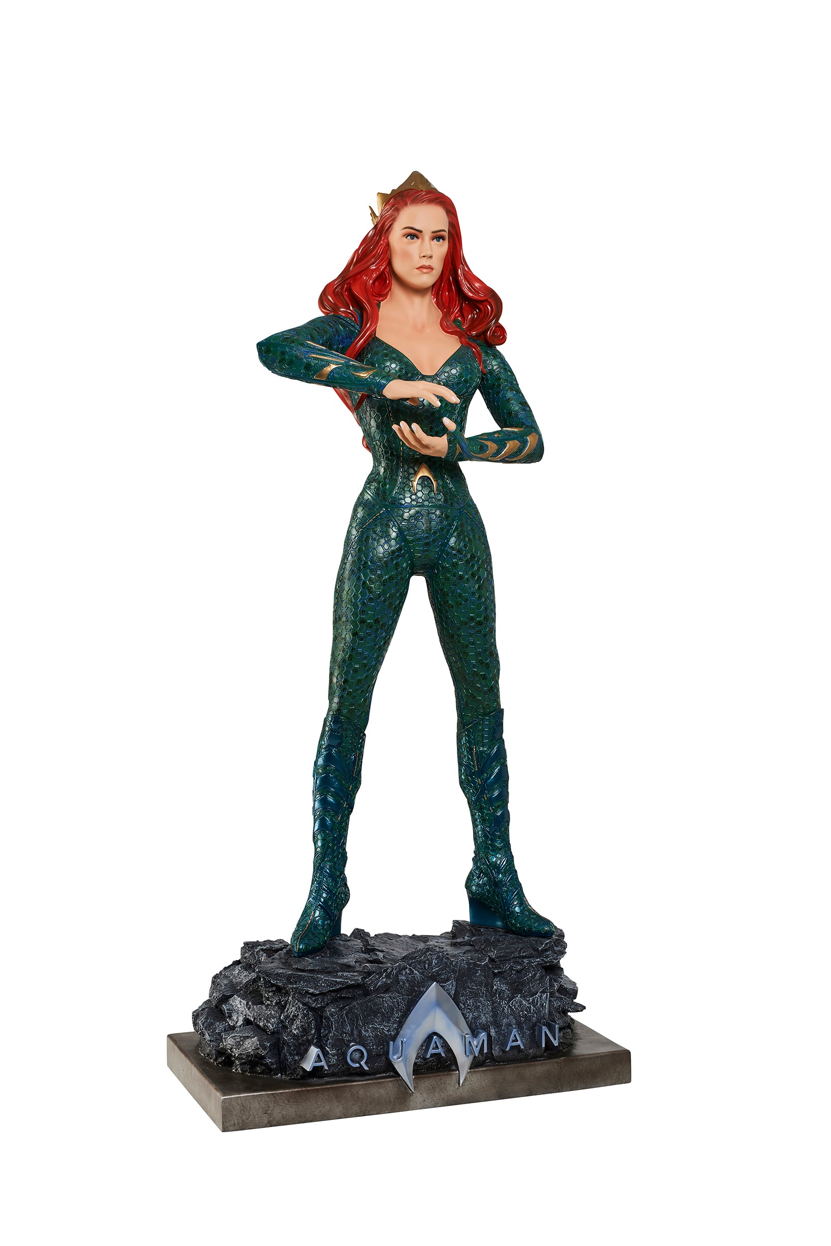 From James Wan's smash success, comes the Queen of Atlantis, Mera, who fights alongside her soulmate, the Atlantian King, Aquaman. Mera is featured in her aquatic suit, featuring her unique octagonal patterns?and is?standing on a custom base which includes the DC film's logo.