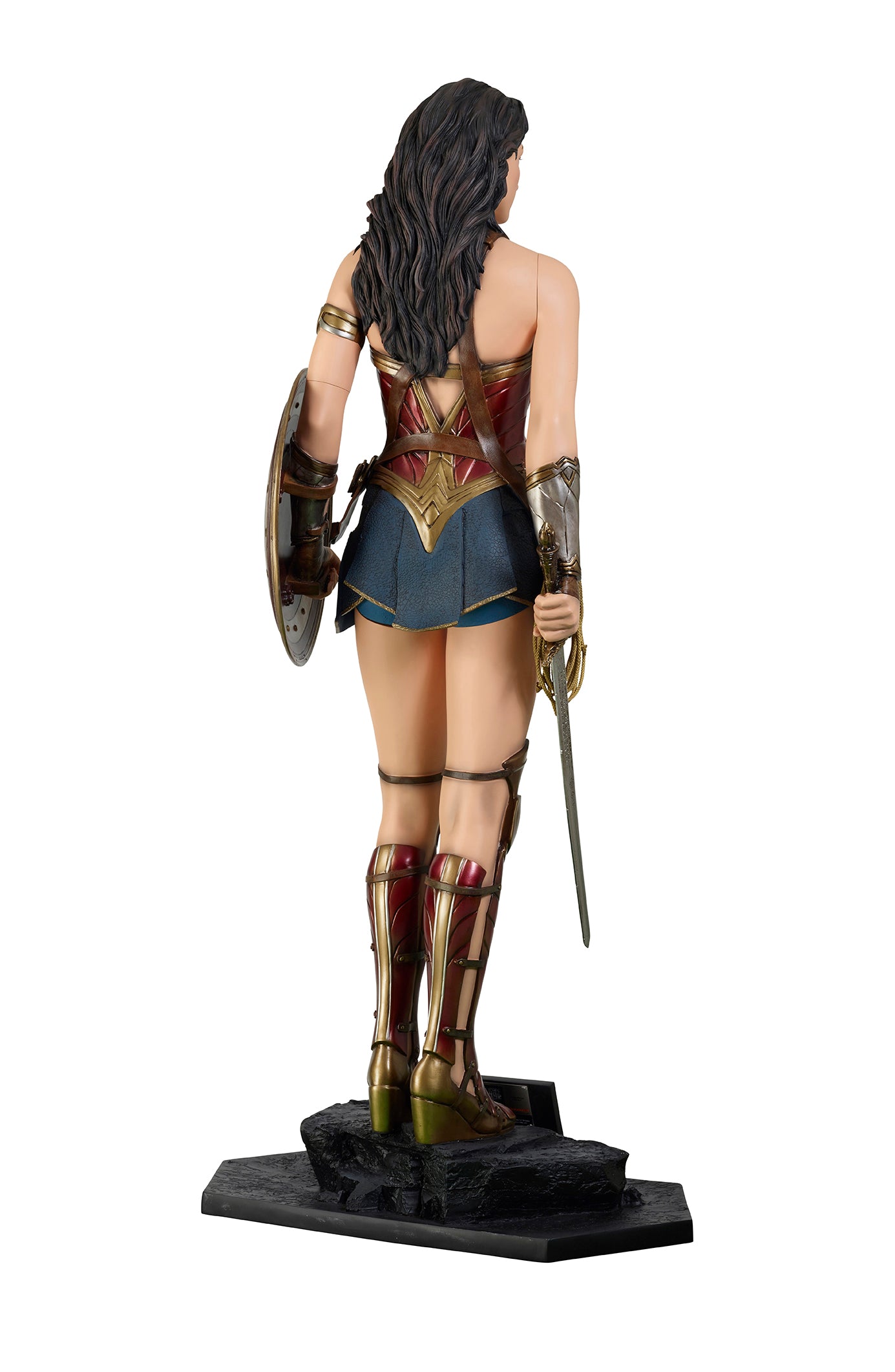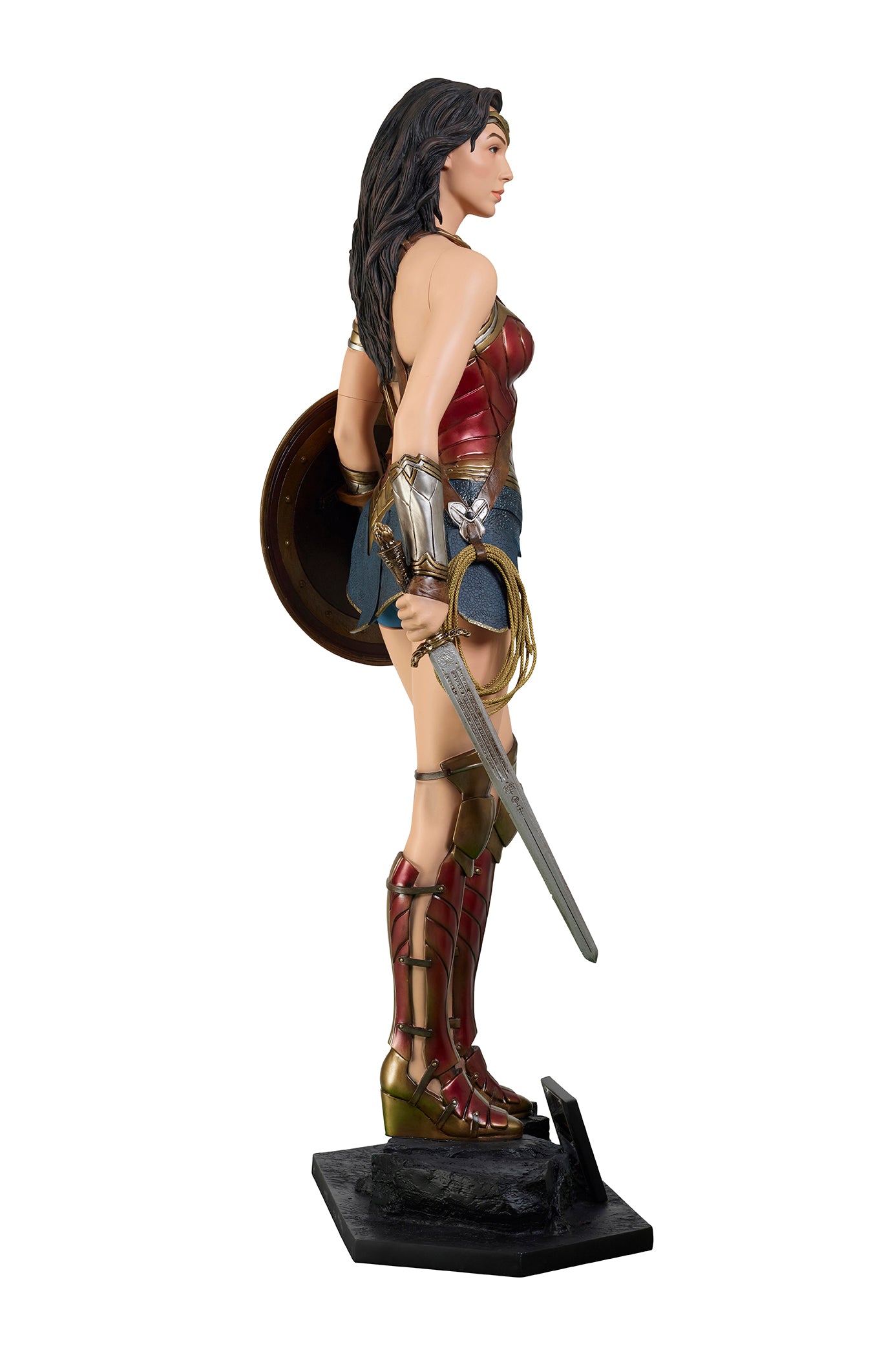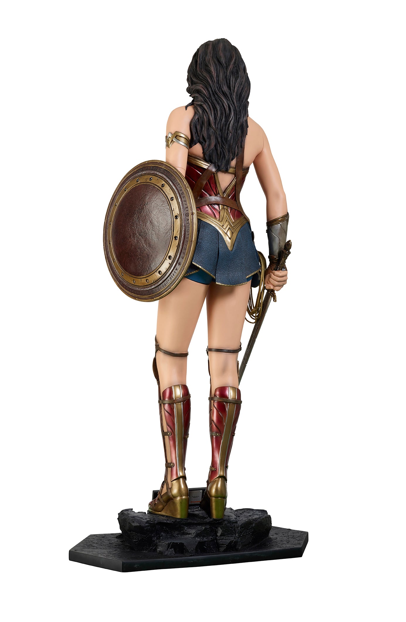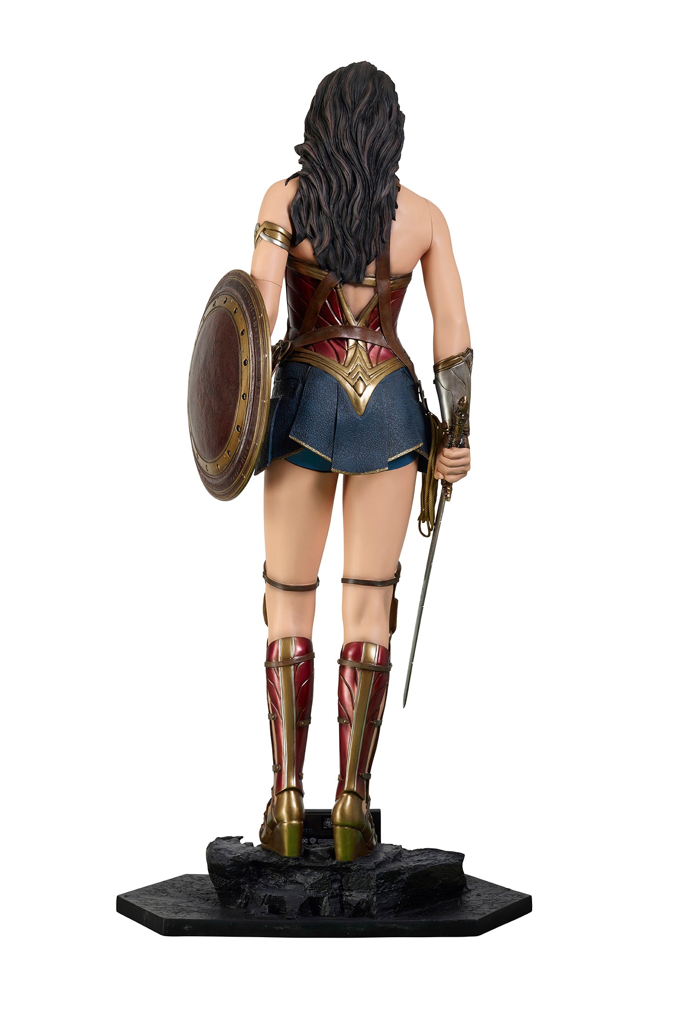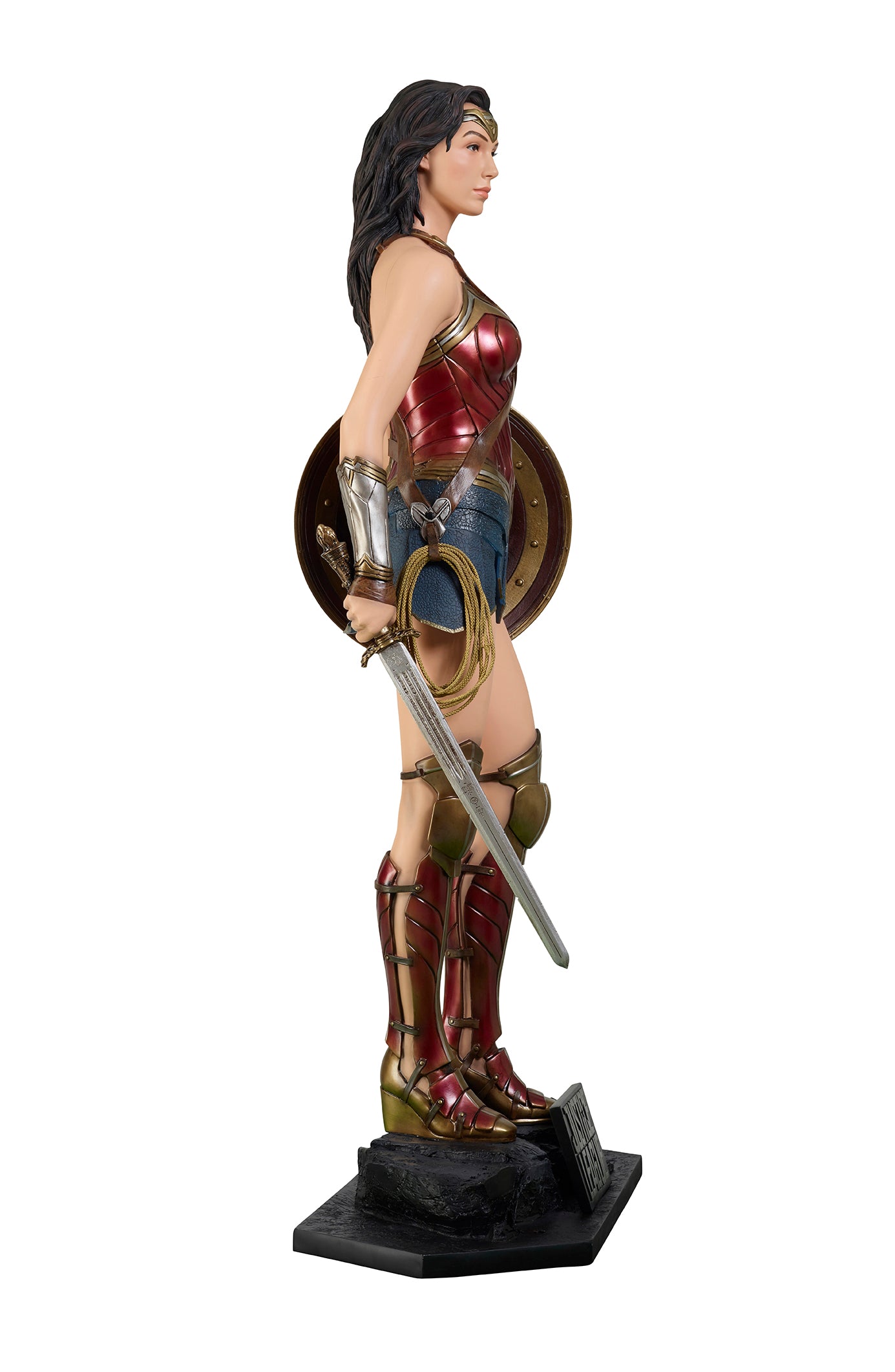 The statue, made from fiberglass and mixed media presents Wonder Woman in her battle armor and comes with her signature weapons of choice: Lasso of Truth, Sword and Shield. Also included is a custom base, which incorporates the film’s logo.