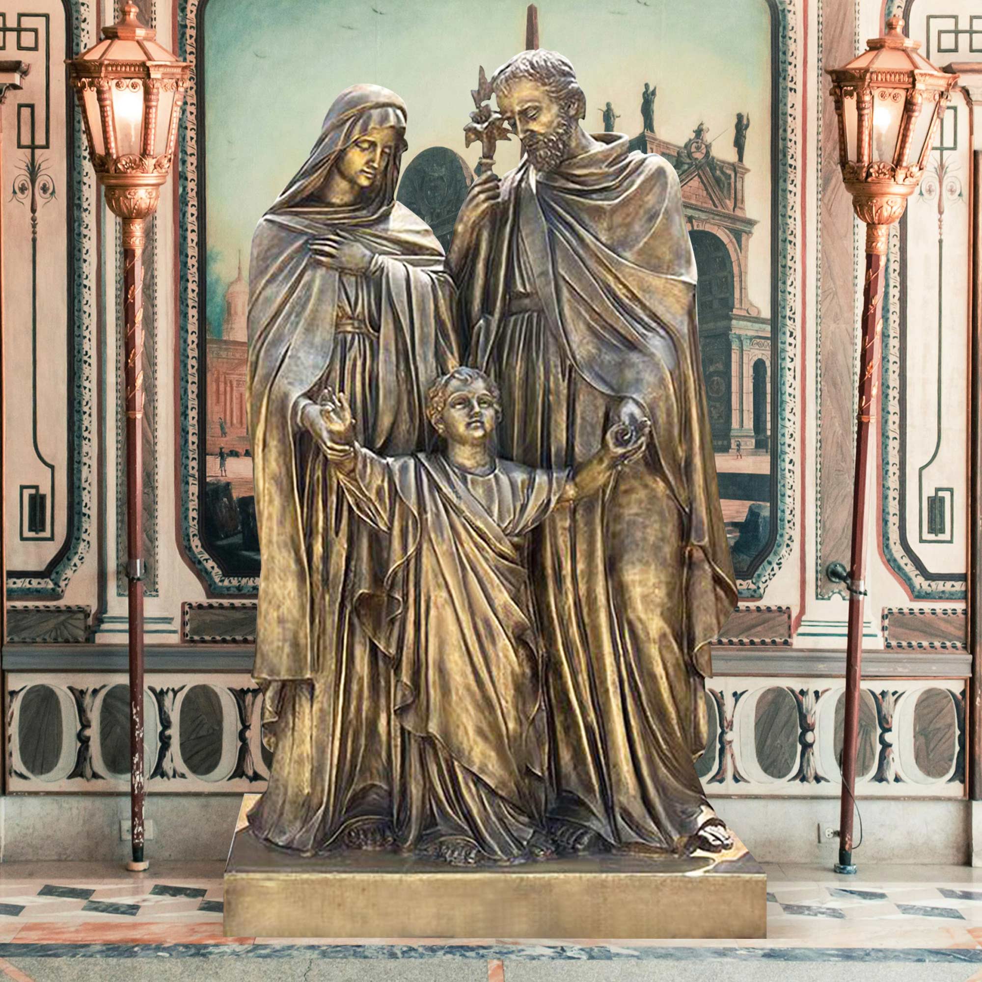 The Religious Bronze Holy Family Sculpture is a profound representation of faith, love, and unity, capturing a moment of connection within the Holy Family—Jesus, Mary, and Joseph. This sculpture is meticulously crafted to depict the serene expressions and gentle interactions of the family, symbolizing the purity of love and the strength of familial bonds. The figures are adorned in flowing robes, with intricate detailing that brings the scene to life.