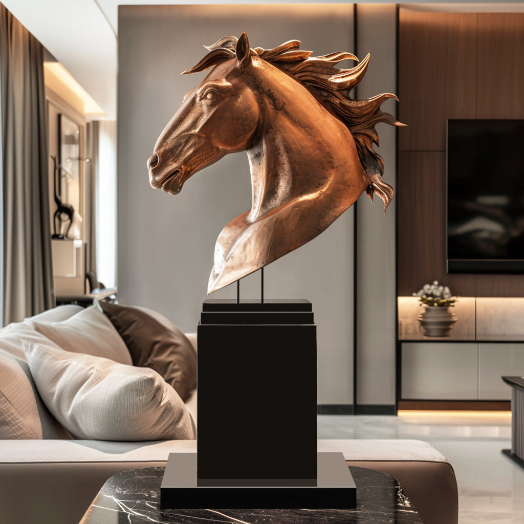 This Indoor Bronze Horse Head Sculpture embodies the nobility, power, and grace of a horse, making it a striking focal point for any interior space. The lifelike details in the horse's flowing mane and dynamic expression exude an air of strength and vitality. Resting on a polished black square base, this modern sculpture blends timeless artistry with a contemporary edge, adding elegance and sophistication to your home, office, or gallery. The polished bronze finish further enhances its luxurious appeal, making it a perfect choice for those who appreciate fine craftsmanship and meaningful design.