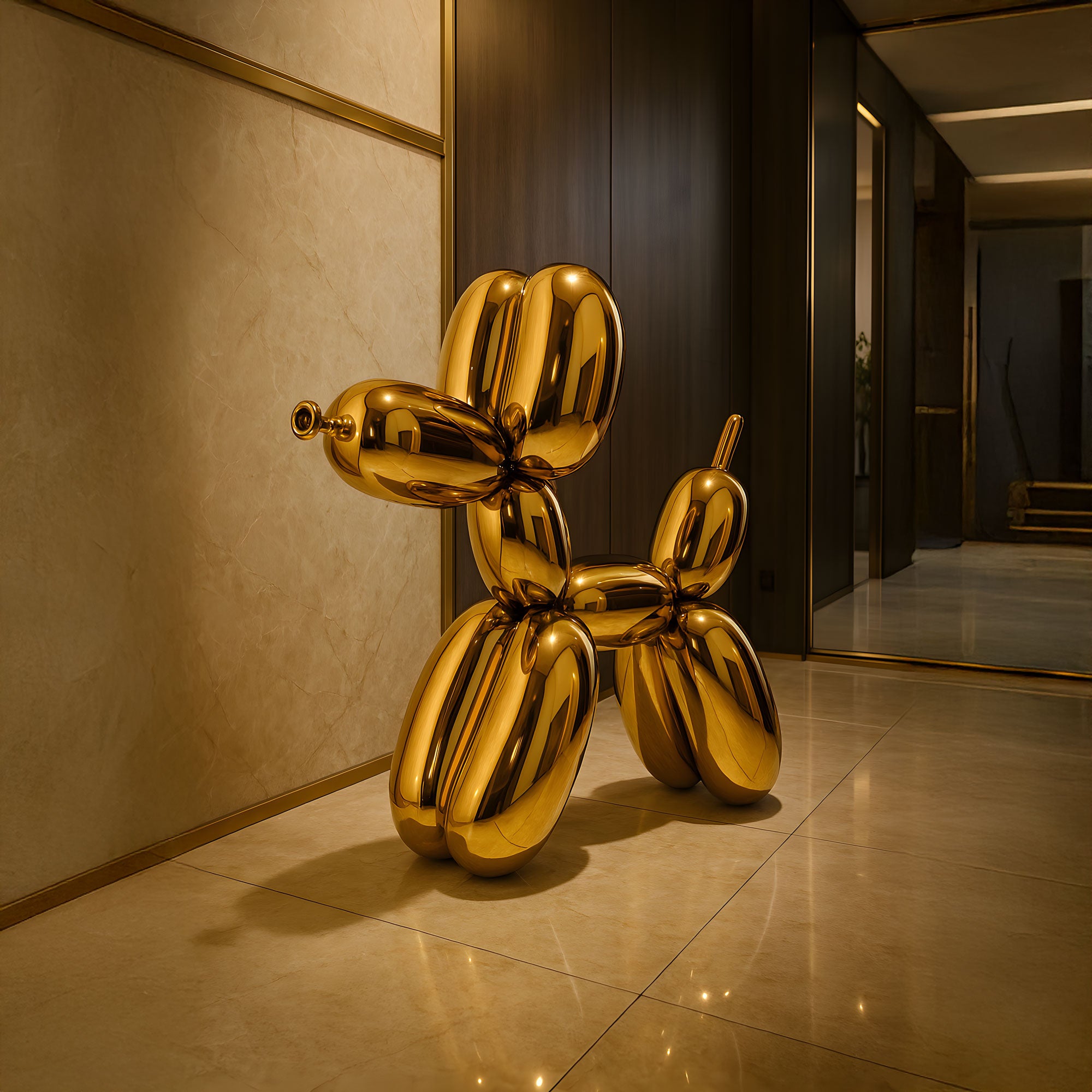 This Gilded Gold Balloon Dog Sculpture stands out as an eye-catching piece, designed to add bold charm to any modern interior or exterior. The sleek, reflective surface creates an elegant yet playful aesthetic, with golden tones that catch the light in any setting. Its unique form, reminiscent of whimsical designs, makes it a statement sculpture that adds luxury to both indoor and outdoor spaces. Its smooth curves and carefully sculpted proportions invite attention, perfect for a contemporary environment that seeks art with a twist.