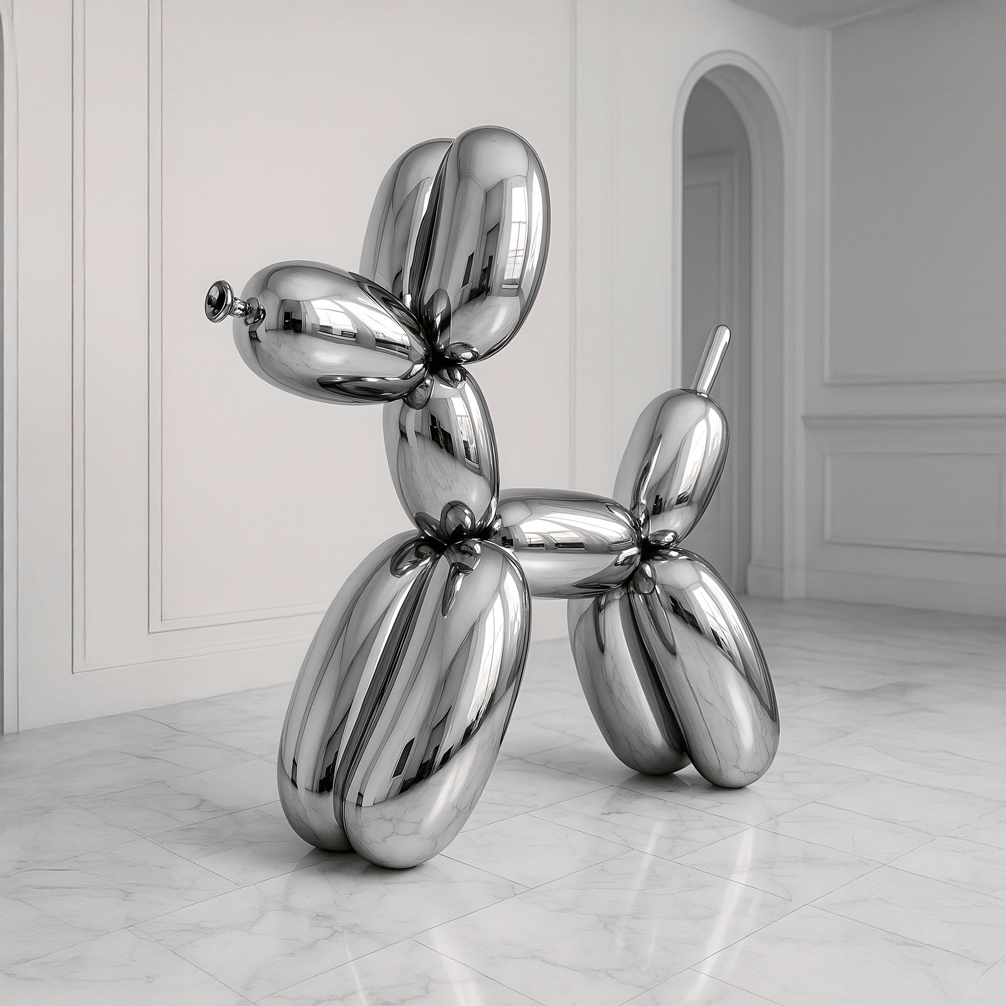 Crafted from high-quality materials, the Mystic Chrome Balloon Dog Sculpture is available in two options: resin, offering a smooth and polished look, and stainless steel, providing a brilliant, lasting shine suitable for the outdoors. The reflective chrome surface interacts beautifully with light, creating dynamic visual effects that enhance the elegance of the piece. Its medium size allows for versatile placement, making it a great addition to any modern or contemporary decor.