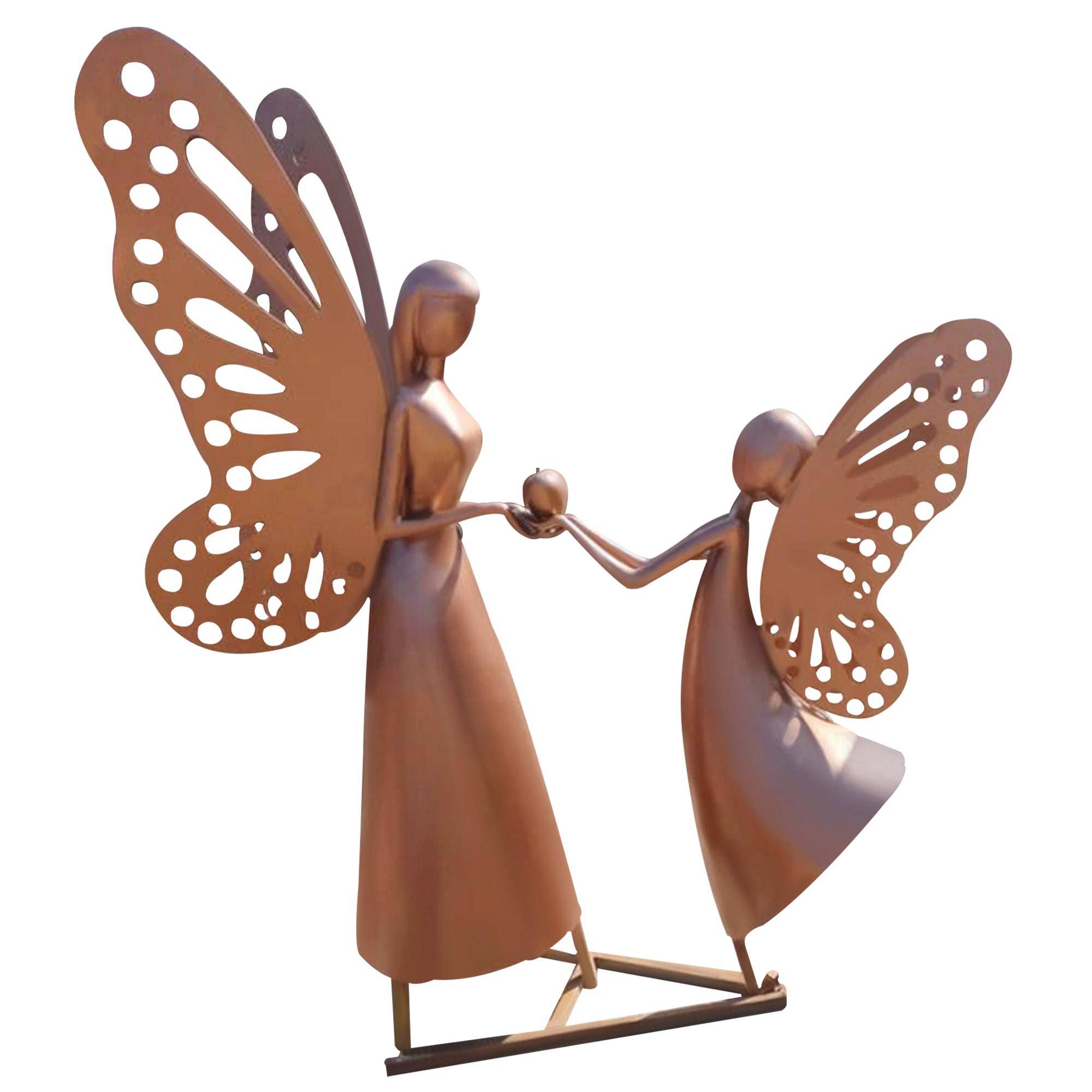 The Butterfly Family Sculpture is a captivating and whimsical piece that beautifully captures the bond between a mother and child, symbolized through graceful butterfly wings. This outdoor sculpture features two abstract figures, a mother and child, each adorned with intricately designed butterfly wings, standing together in a moment of connection and joy. The polished copper finish adds warmth and elegance, while the minimalist design allows the sculpture to blend seamlessly into natural surroundings.