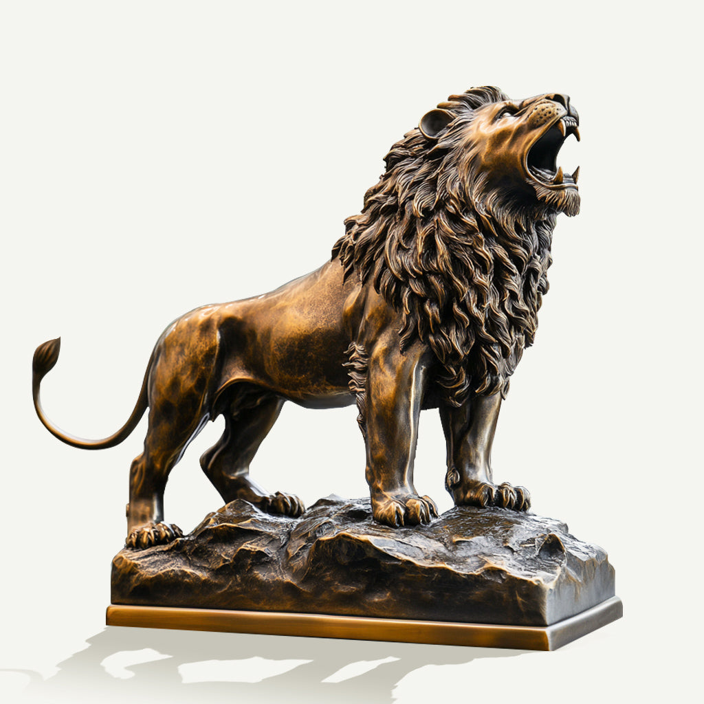 This Custom Indoor Roaring Bronze Lion Sculpture showcases the untamed power and majesty of the king of beasts. With its commanding pose and roaring expression, this indoor lion statue embodies authority, courage, and confidence. The polished bronze finish enhances the lifelike detailing, from the flowing mane to the muscular form, creating a striking visual impact. Whether displayed this animal statue in an office or luxury interior, it is a bold statement piece that adds character and a sense of grandeur to any space.