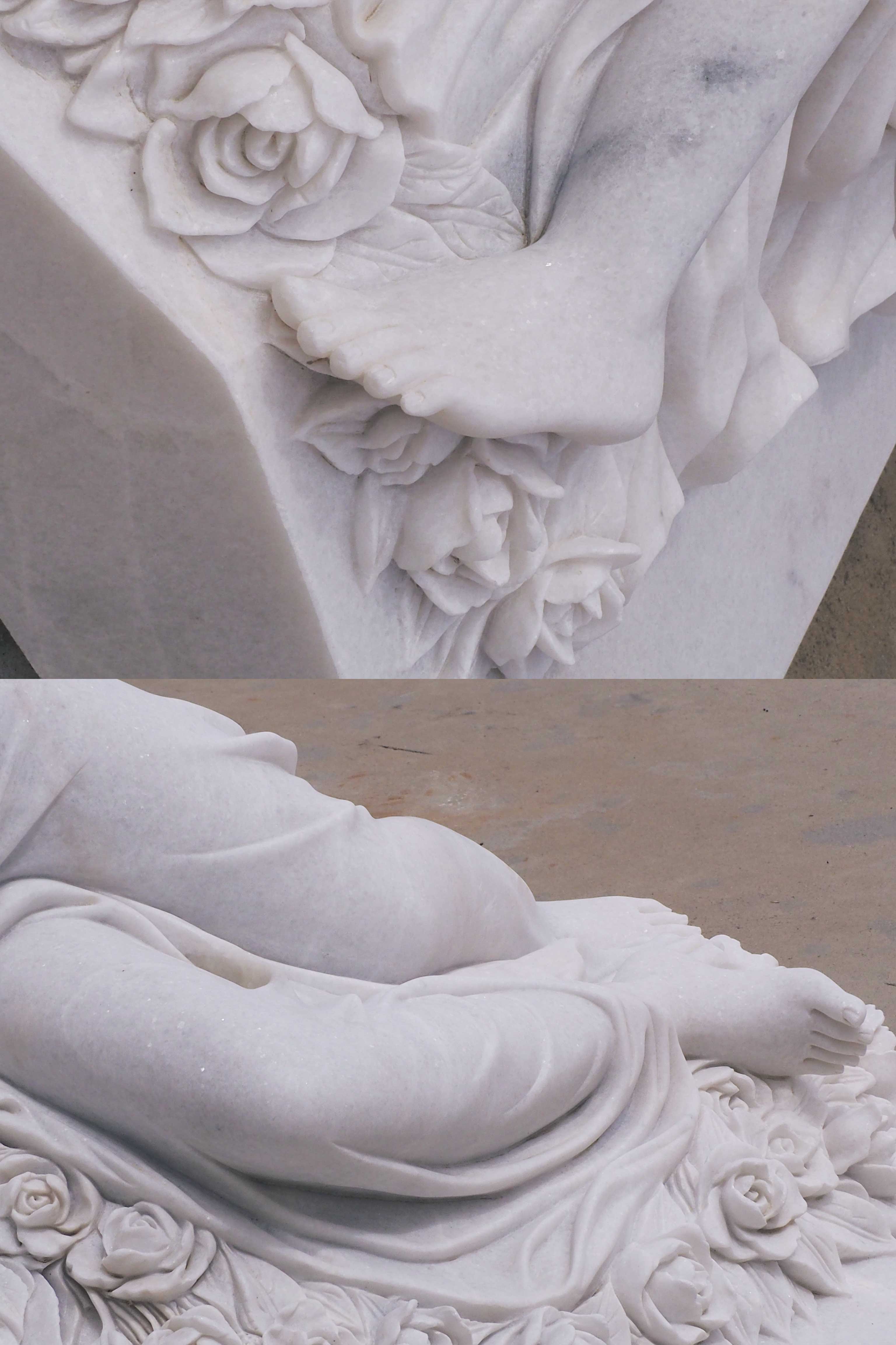 This White Marble Fallen Angel Sculpture beautifully captures an angel in repose, evoking a sense of peace, love, and deep reflection. The elegant wings and delicate details bring an air of grace and poignancy, making it a perfect tribute for gardens, memorial spaces, or serene indoor settings. The smooth white marble finish adds an ethereal quality, blending harmoniously into any peaceful environment.
