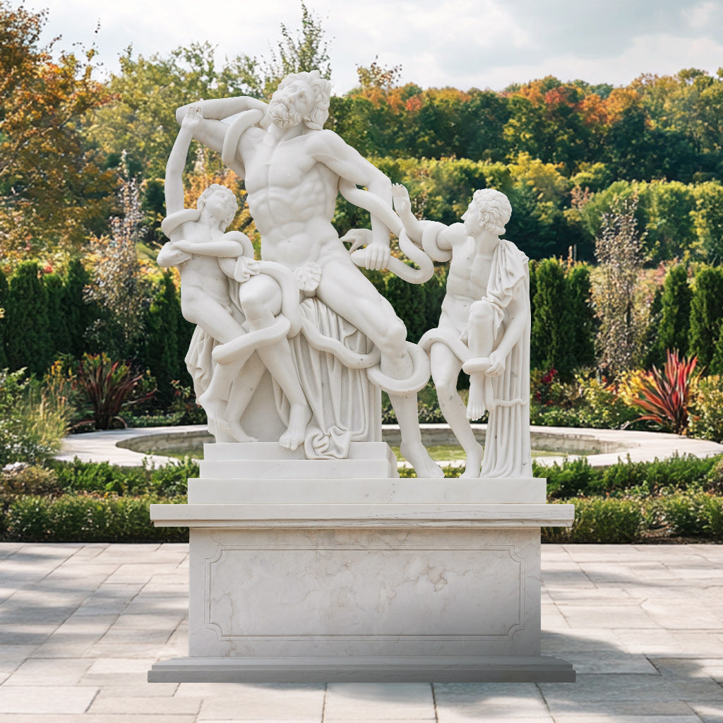 This striking marble reproduction of the Laocoön and His Sons Marble statue captures the intense drama and powerful emotion of the original Hellenistic masterpiece. Depicting the Trojan priest Laocoön and his sons ensnared by sea serpents, this sculpture is a vivid portrayal of human struggle and heroism. Each intricately carved muscle and expression brings a sense of movement and life to the piece, making it a captivating focal point. Perfect for adding a sense of history and grandeur, this sculpture is ideal for indoor or outdoor settings, bringing a timeless elegance to gardens, museums, or luxury estates.
