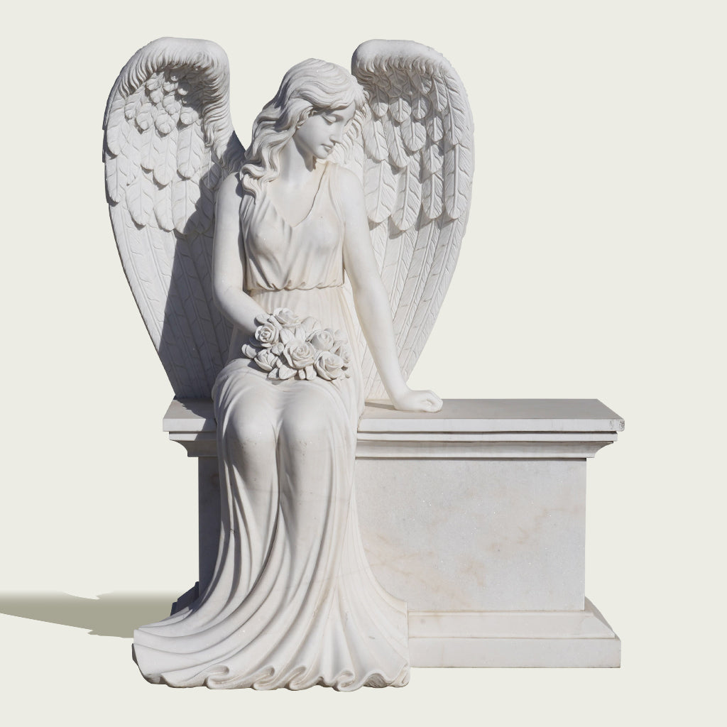 The Garden Memorial Angel Statue embodies tranquility and remembrance. This serene angel is depicted seated on a bench, holding a bouquet of roses, with her wings gracefully spread. The calm expression and flowing robes offer a peaceful tribute to loved ones, making this angel memorrial sculpture a perfect addition to memorial spaces or gardens. Crafted from high-quality natural stone, this marble statue adds a timeless sense of grace and comfort.