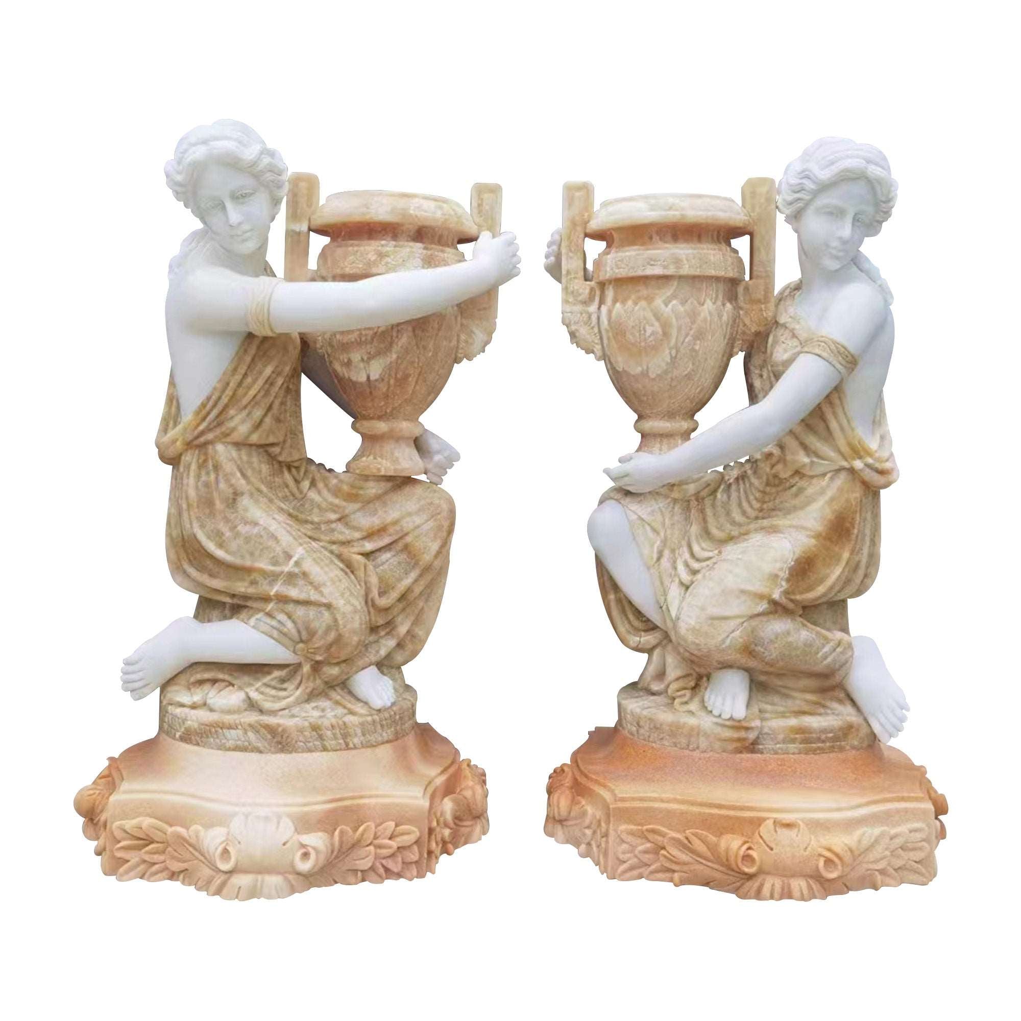 This pair of Sitting Maidens with Urns Marble Garden Sculpture captures the grace and beauty of classical Greek and Roman art. Crafted in rich dual-tone marble, each maiden is intricately detailed, holding a large, ornately decorated urn. This design embodies elegance and timeless beauty, adding sophistication to any setting. The earthy marble tones bring warmth and natural charm, while the smooth polish enhances the lifelike quality of the figures.