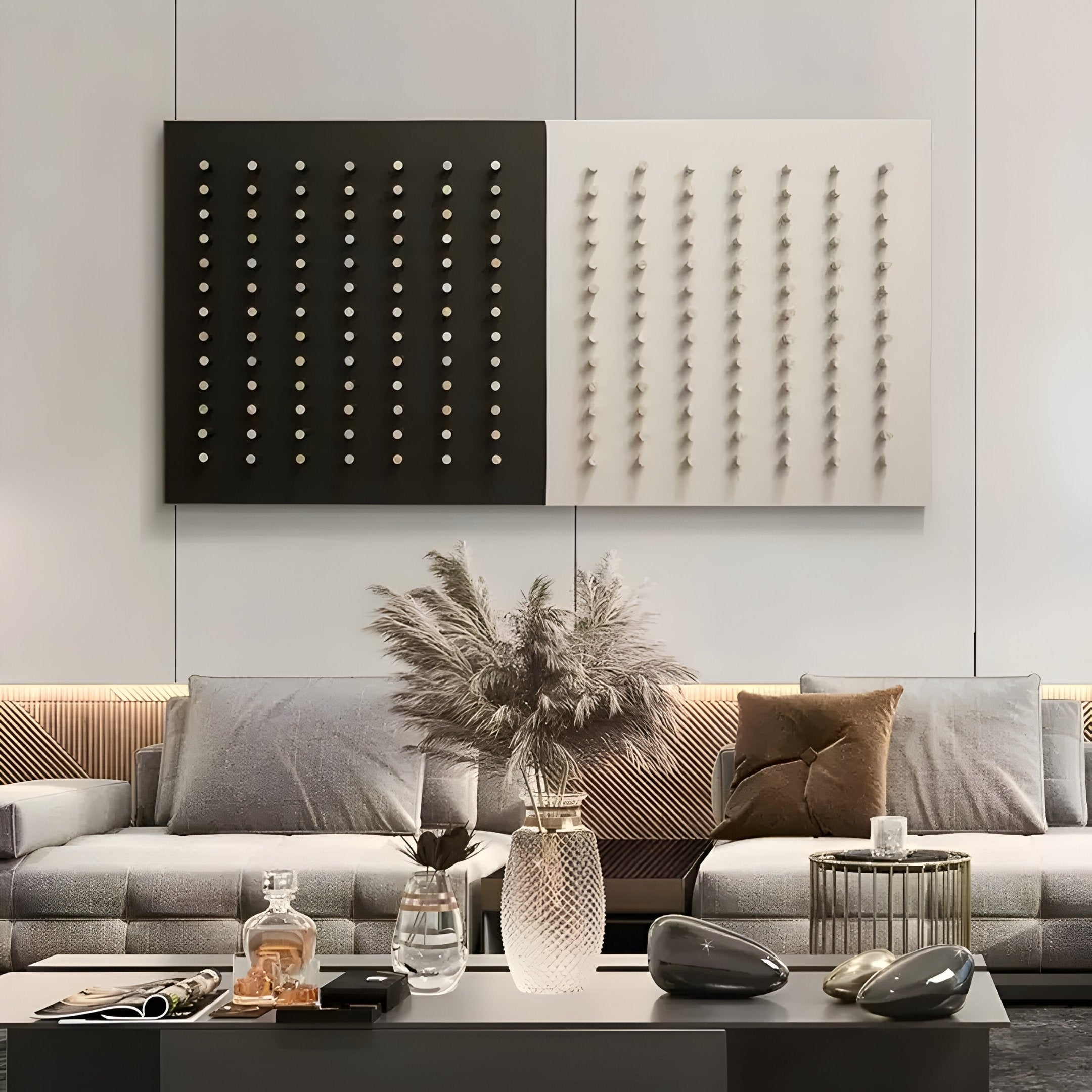 Crafted with meticulous attention to detail, the Contrasto Dual-Tone Geometric 3D Wooden Wall Art is a captivating piece of artistry. This wall-mounted installation showcases a striking contrast between its black and white halves, interspersed with evenly arranged cylindrical wooden projections. The minimalist design is complemented by the rhythm and texture of the geometric elements, creating an interplay of depth and shadow. Perfect for contemporary interiors, this piece adds a sense of structure and refinement to any wall.