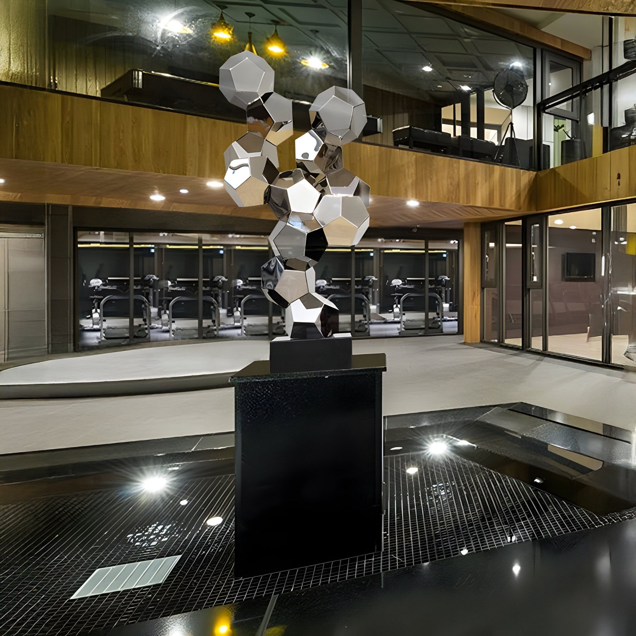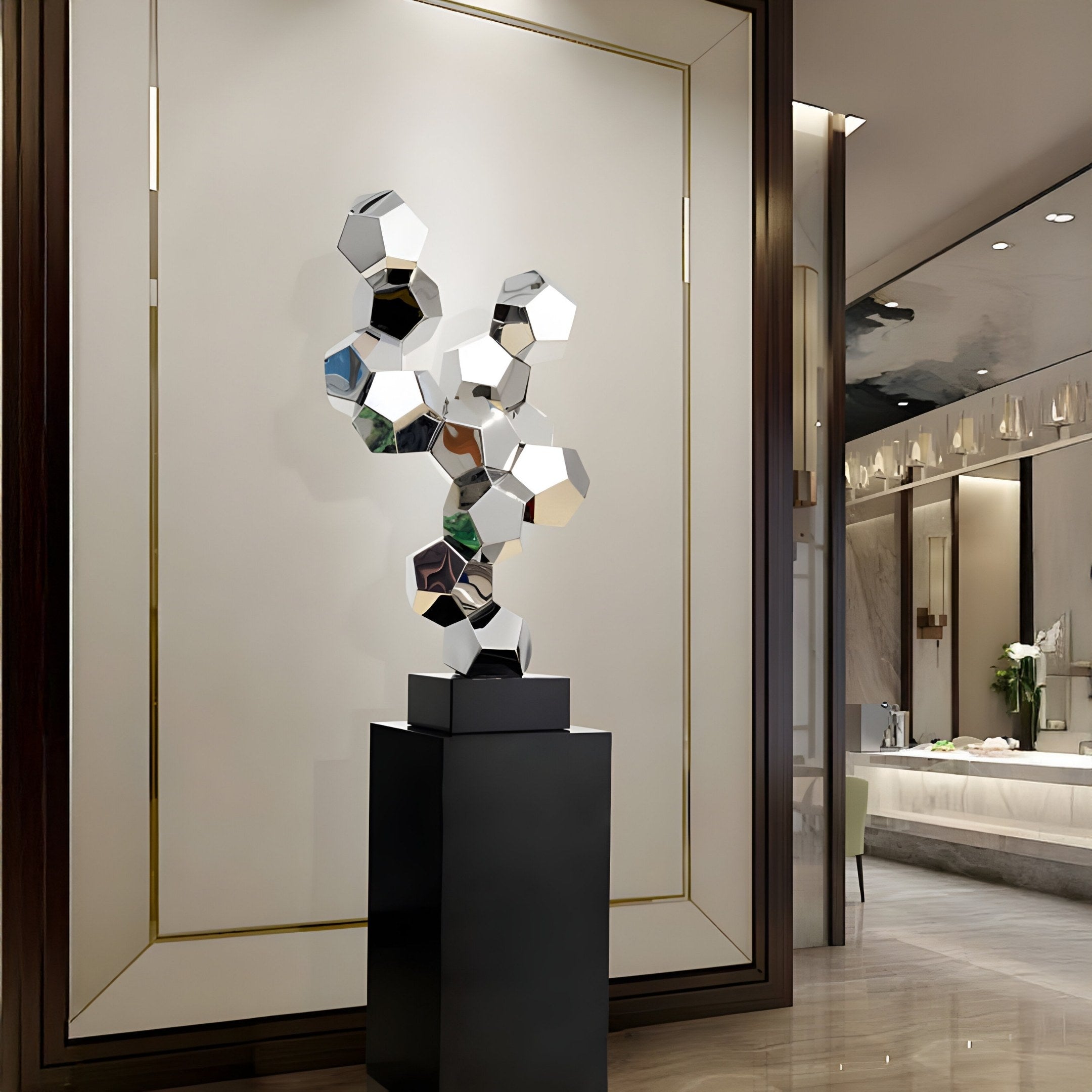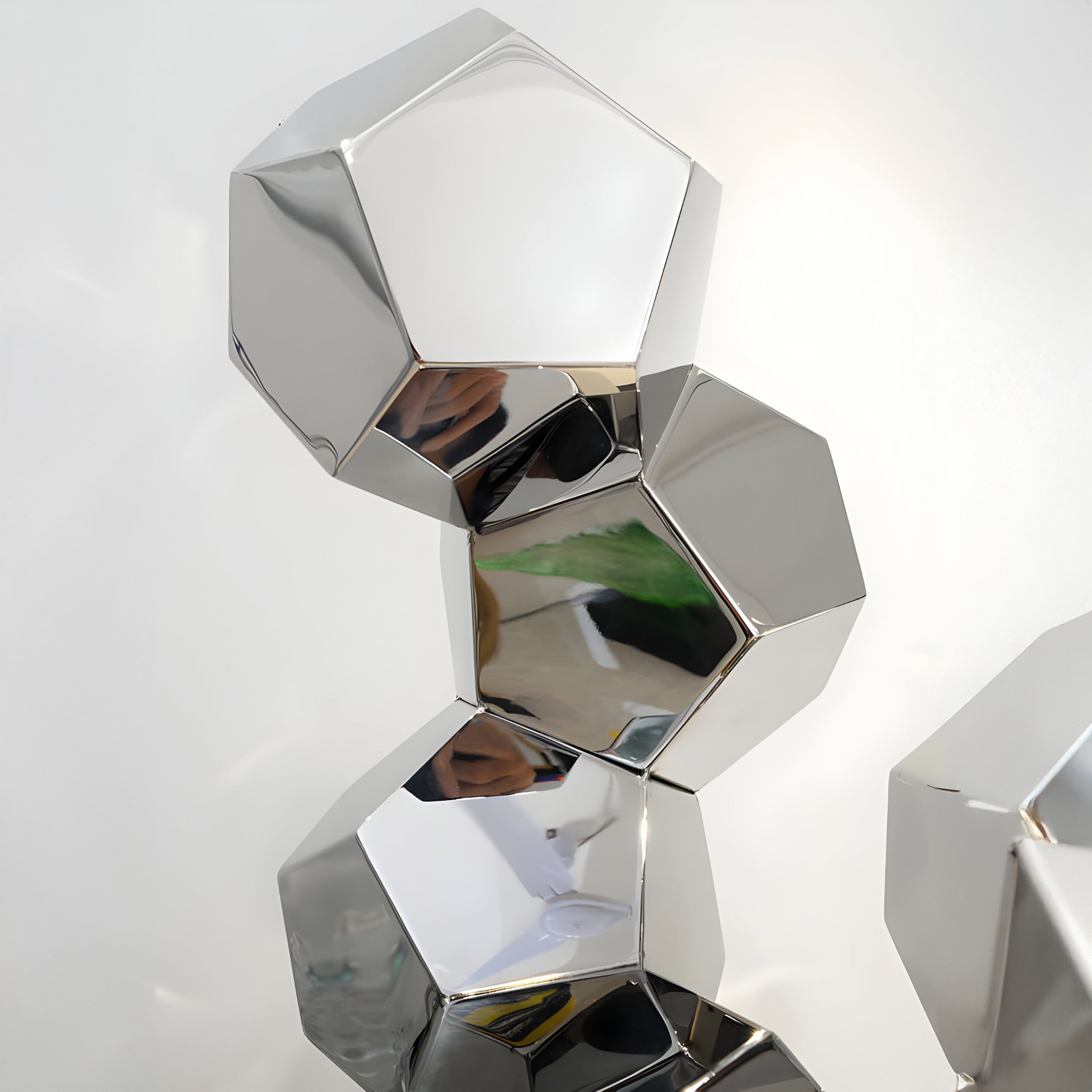 Designed for versatility, this silver geometric sculpture enhances both indoor and outdoor settings. Its durable, weather-resistant construction makes it an ideal addition to gardens, patios, or corporate landscapes, where it complements architectural features and natural elements. Indoors, it elevates spaces like galleries, lobbies, or modern living areas, harmonizing with minimalist and modern décor styles. The sculpture's abstract form not only adds aesthetic appeal but also stimulates conversation and contemplation. Whether you're an art enthusiast or seeking to enrich your surroundings with a unique piece, this polished stainless steel art offers timeless allure and profound artistic impact.
