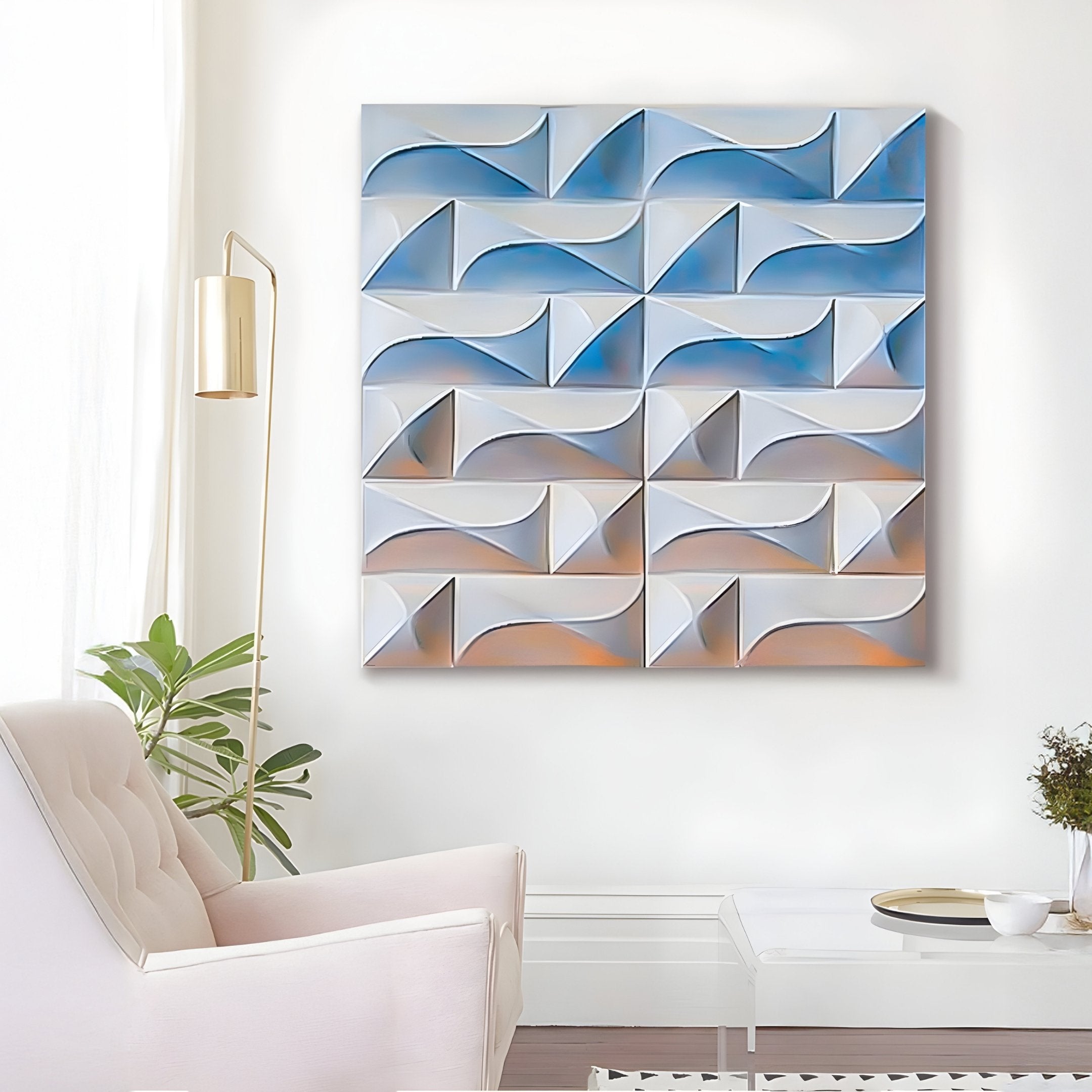 Arranged in a neat grid, the Elysia Geometric Cool Gradient Wood Relief 3D Wall Art combines clean lines and delicate curves to form a captivating fusion of abstract design. Each wooden panel is meticulously carved, exhibiting crisp, flowing segments that intersect to create a subtle interplay of positive and negative space. Hand-painted in a cool gradient palette that shifts through soft blues, greys, and understated beige accents, this artwork exudes a tranquil yet modern charm. A light sandstone finish adds gentle texture, highlighting the precision of each shape while lending an almost tactile quality to the overall composition.