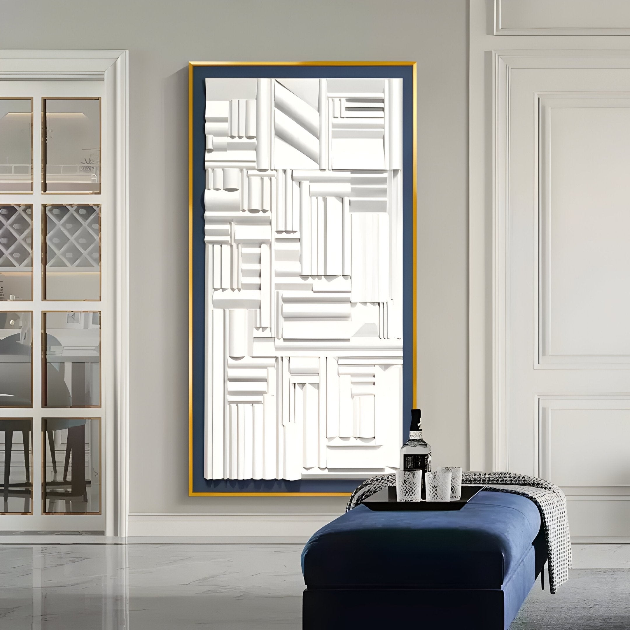 The Forma Blue-Frame White Geometric 3D Wooden Vertical Wall Art introduces a poised blend of modern shapes and raised relief. A series of white geometric layers is arranged across a vertical panel, creating visual depth that keeps the eye engaged. Each section has been carefully carved, forming an intricate patchwork of lines and contours. The subdued white elements contrast with the subtle blue edge, enclosed by an aluminium alloy frame that brings a refined finish. Thanks to this sculptural construction, light and shadows shift throughout the day, ensuring that the piece evolves along with its surroundings. Positioned in an entryway, lounge, or hallway, it delivers a balanced touch of innovation without overpowering the overall space.