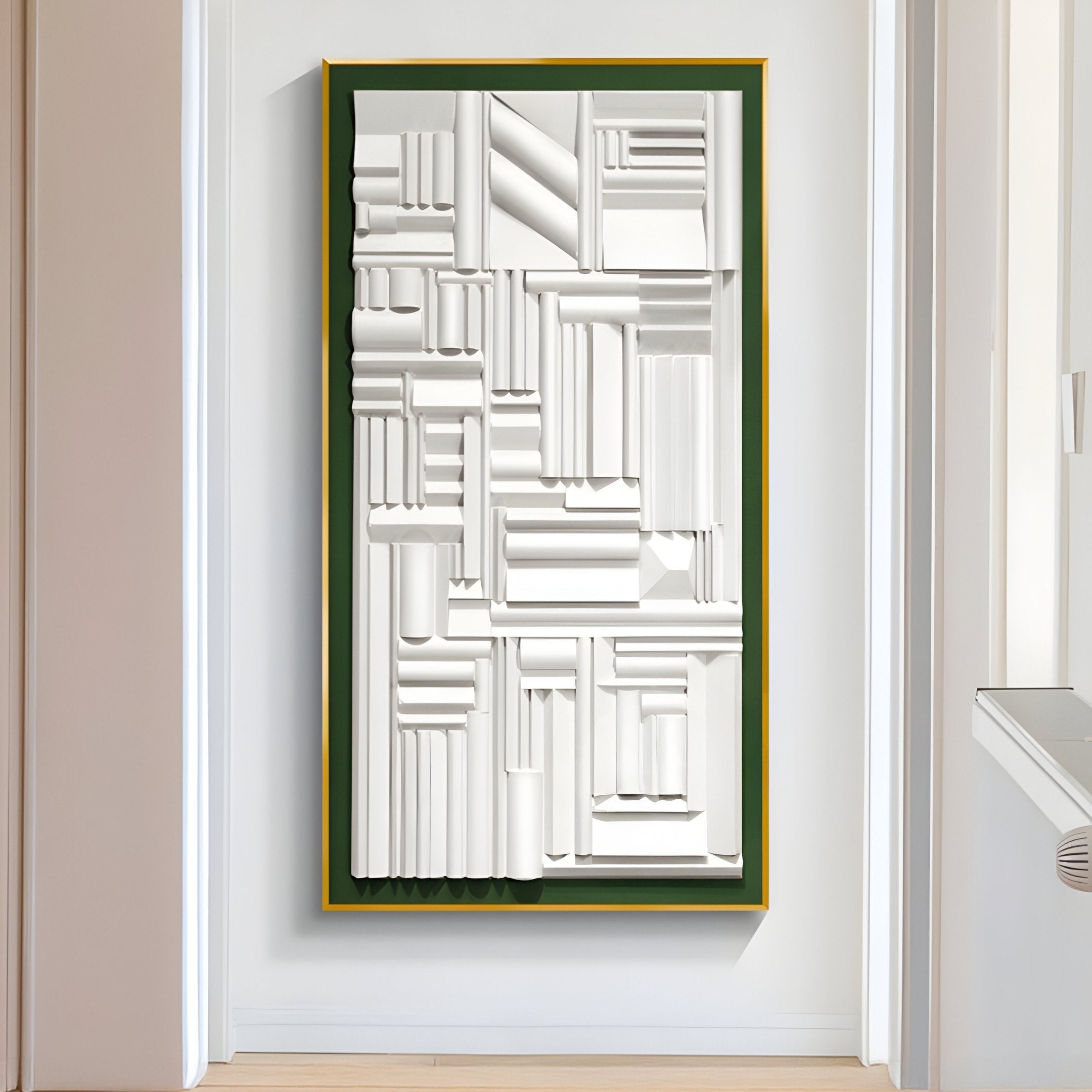 This striking vertical wall art combines a white geometric relief design with a sophisticated green frame, creating an elegant interplay of shapes and tones. The meticulously crafted three-dimensional composition showcases overlapping blocks, ridges, and angles, offering a visually engaging texture. The crisp white palette contrasts beautifully with the deep green border, accented by a refined golden lining, lending the piece a sense of depth and modernity. Made with durable materials, the relief utilises premium wood and is framed in lightweight aluminium alloy for a sturdy yet sleek finish.