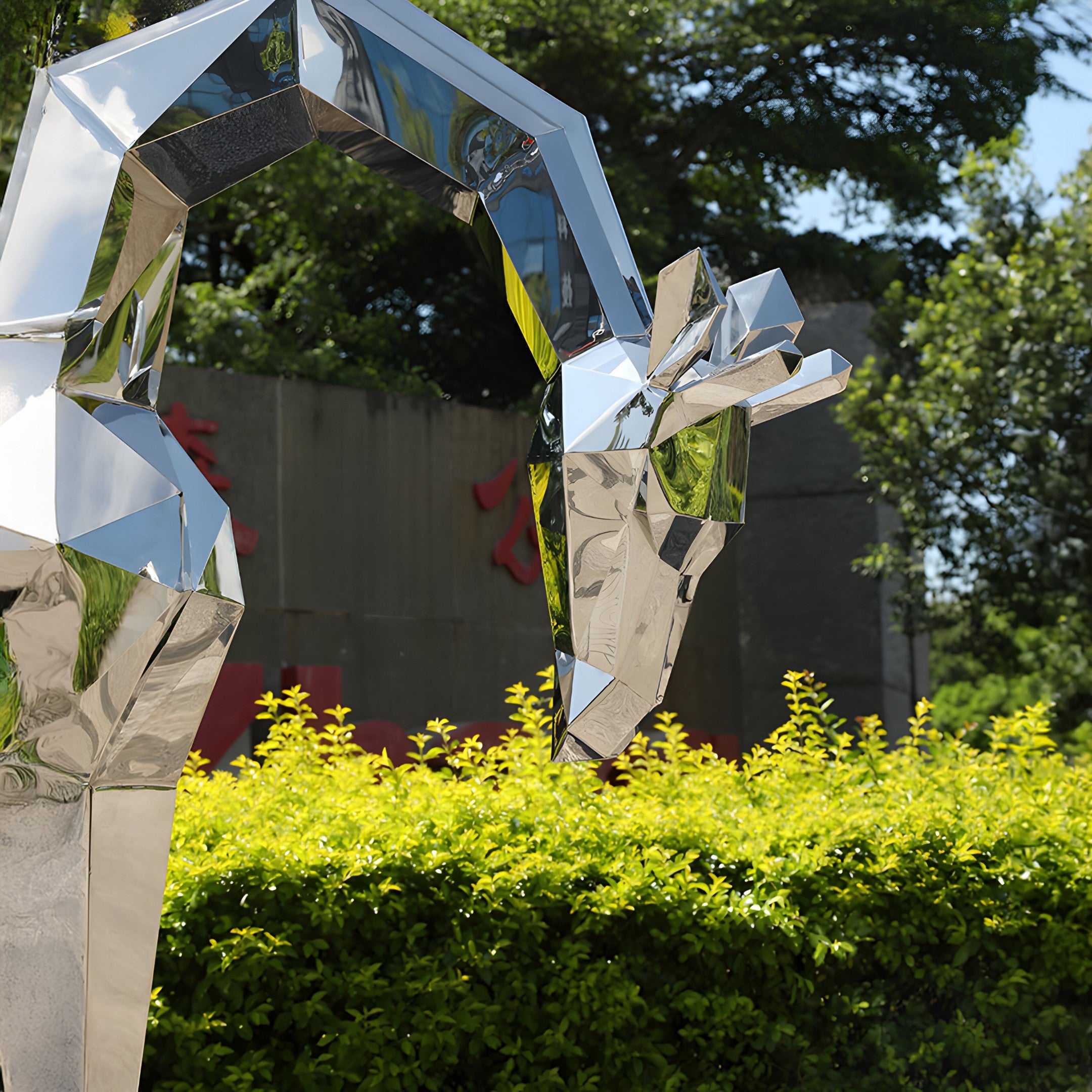 Ideal for both indoor and outdoor settings, this geometric giraffe sculpture enhances gardens, patios, living rooms, and office spaces alike. Its durable stainless steel construction ensures it withstands various weather conditions, maintaining its lustrous appearance over time. The sculpture's modern aesthetic complements a variety of decor styles, from minimalist to eclectic. Whether placed amidst greenery or as a statement piece in a foyer, this sculpture adds artistic flair and sophistication to your surroundings. Embrace the blend of nature-inspired design and contemporary art with this remarkable sculpture.