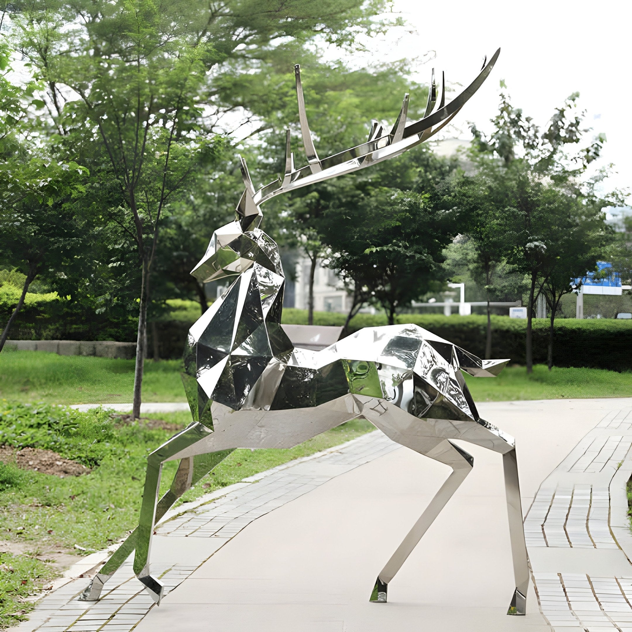 Designed for exceptional versatility, the Noble Deer III sculpture effortlessly adapts to both indoor and outdoor environments. Its weather-resistant construction guarantees longevity, maintaining its stunning appearance year after year. Perfect for expansive gardens, elegant patios, spacious courtyards, or sophisticated landscaped areas, this stainless steel sculpture harmonizes with natural elements and contemporary architectural features alike. Indoors, it enhances spaces such as living rooms, office lobbies, or art galleries, seamlessly integrating with diverse décor styles to elevate the aesthetic appeal. The intricate geometric design and reflective surfaces not only serve as an artistic centerpiece but also contribute to creating a tranquil and sophisticated atmosphere. Whether you're an art enthusiast or seeking to add a unique decorative element to your space, the Noble Deer III Geometric Stainless Steel Sculpture offers enduring beauty and exceptional craftsmanship that transcends trends.