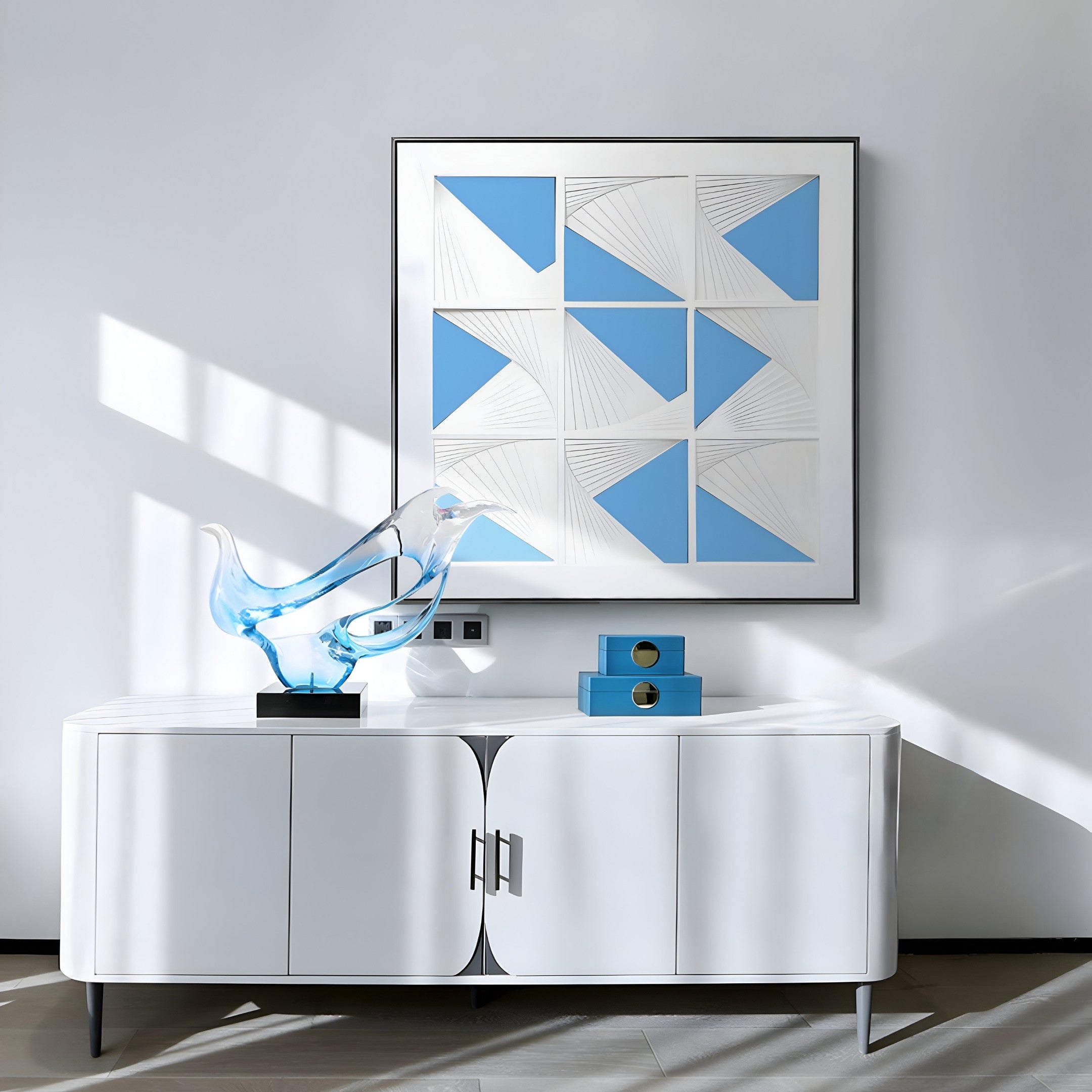 This Prismatics Blue Geometric Cardboard Carving Wall Art is a striking piece of modern artistry. Featuring a dynamic grid of triangles and arcs in crisp white and vivid blue, this artwork draws the eye with its clean geometric precision. The layered cardboard craft, accentuated by fine grooves and cut-outs, creates a mesmerising interplay of light and shadow. Encased in a sturdy aluminium frame, the piece blends the simplicity of cardboard with the sophistication of acrylic, making it a contemporary masterpiece.