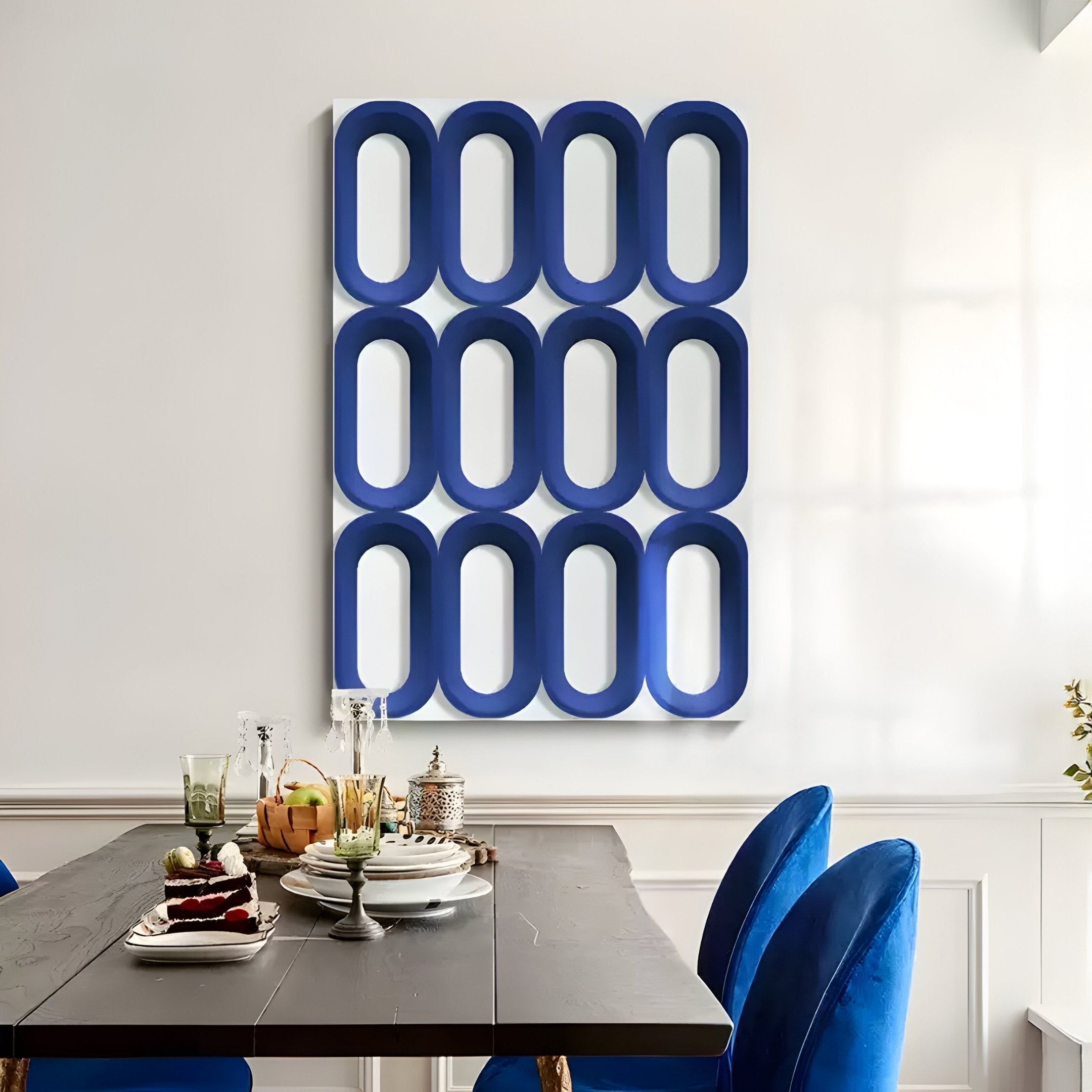 The Revela White & Blue Geometric Wood Relief 3D Wall Art plays with shape, space and rhythm to create a clean yet captivating design. Featuring a structured grid of vertically aligned pill-shaped cut-outs, this abstract wall sculpture balances solid and negative space in perfect harmony. Each form is precisely carved from wood and finished in a matte ultramarine blue that lends it depth without reflectivity. The elliptical shapes, reminiscent of links or loops, are set against a white backing, which highlights the bold colour and introduces contrast. From a distance, the piece feels graphic and architectural; up close, the dimensional relief creates natural shadows that evolve with lighting and angle.