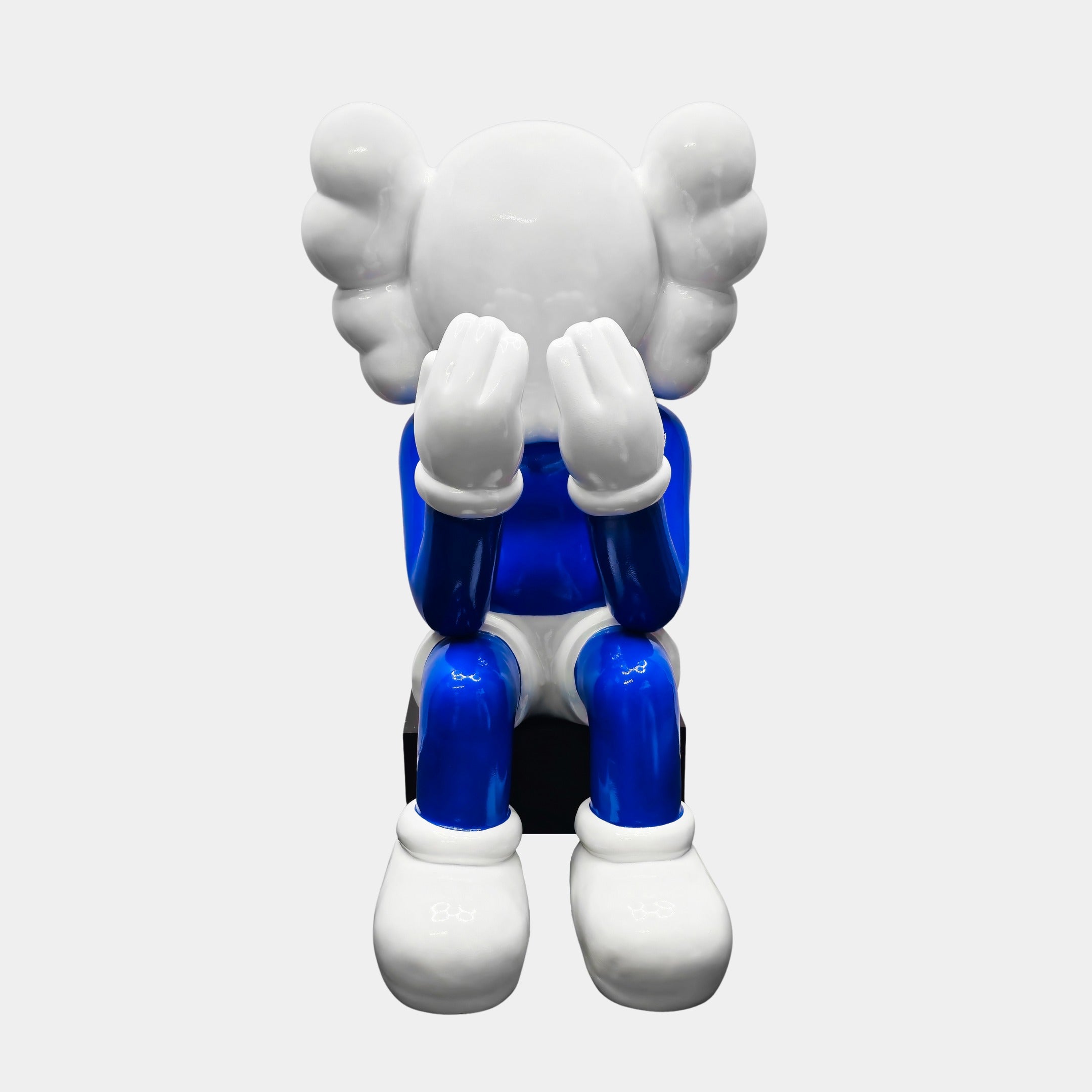 A striking blend of modern art and raw emotion, the White & Blue Iconify Melancholy Sitting Sculpture captures a moment of deep introspection and self-reflection. Crafted from premium resin, this contemporary piece features a stylized figure seated on a geometric stack of cubes, its head buried in its hands, evoking a powerful sense of contemplation. The crisp white body is beautifully contrasted by deep blue accents, adding depth, dimension, and visual intrigue. This interplay of color creates a sculptural statement that resonates with emotion, making it a unique centerpiece for contemporary spaces. With its fluid contours and seamless construction, this piece exudes an air of sophistication while maintaining an expressive artistic edge. The fine detailing and smooth surfaces make it an exquisite example of modern craftsmanship, blending minimalist design with profound emotional weight.