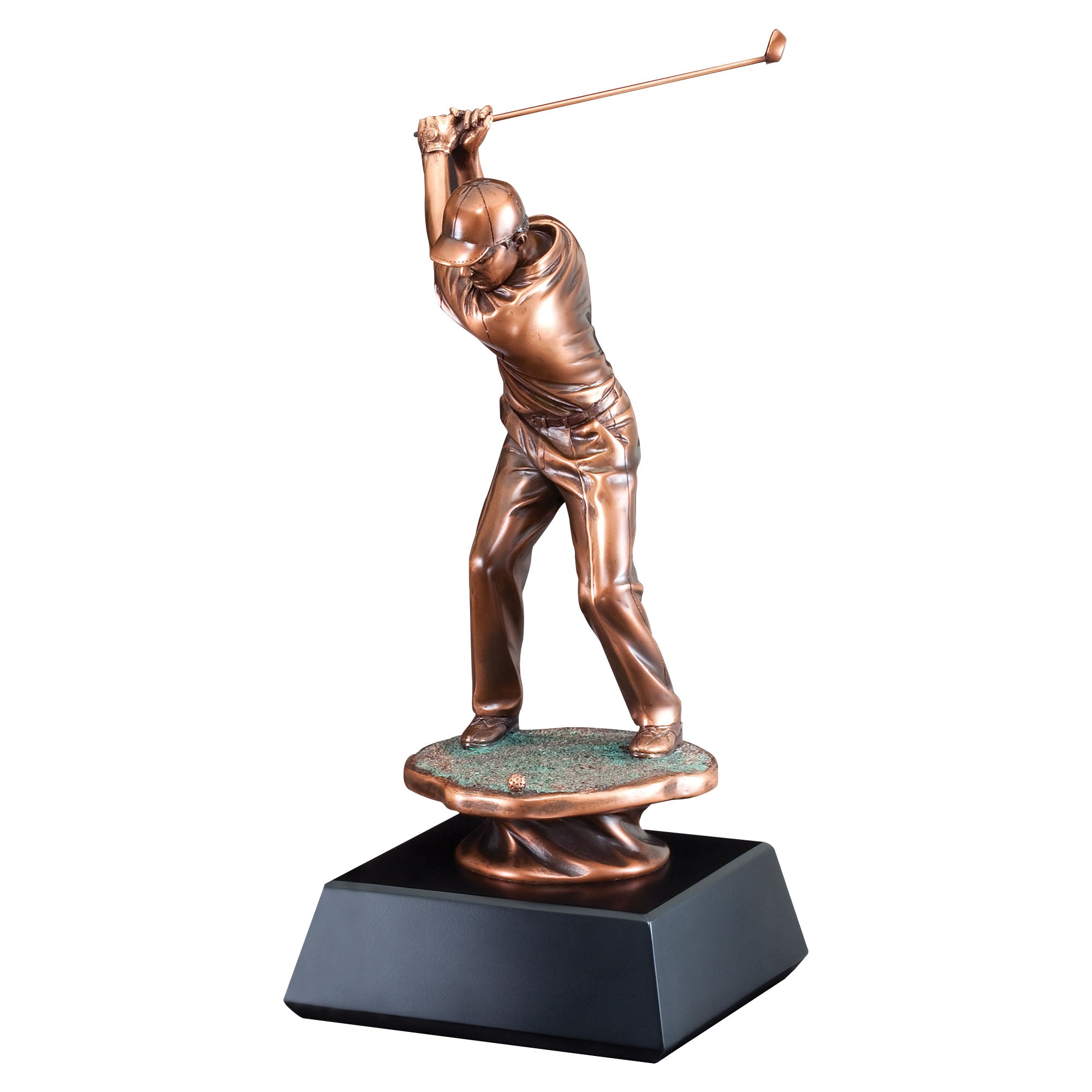 The Bronze Castings Golfer Swing Sculpture is a striking representation of the elegance and precision of a golfer mid-swing. This finely crafted sculpture captures the dynamic movement and focused energy of the golfer, showcasing the athlete in a perfect follow-through position. The polished bronze finish gives the piece a sophisticated and timeless look, while the sturdy black base provides a solid foundation, making it ideal for display in various settings.