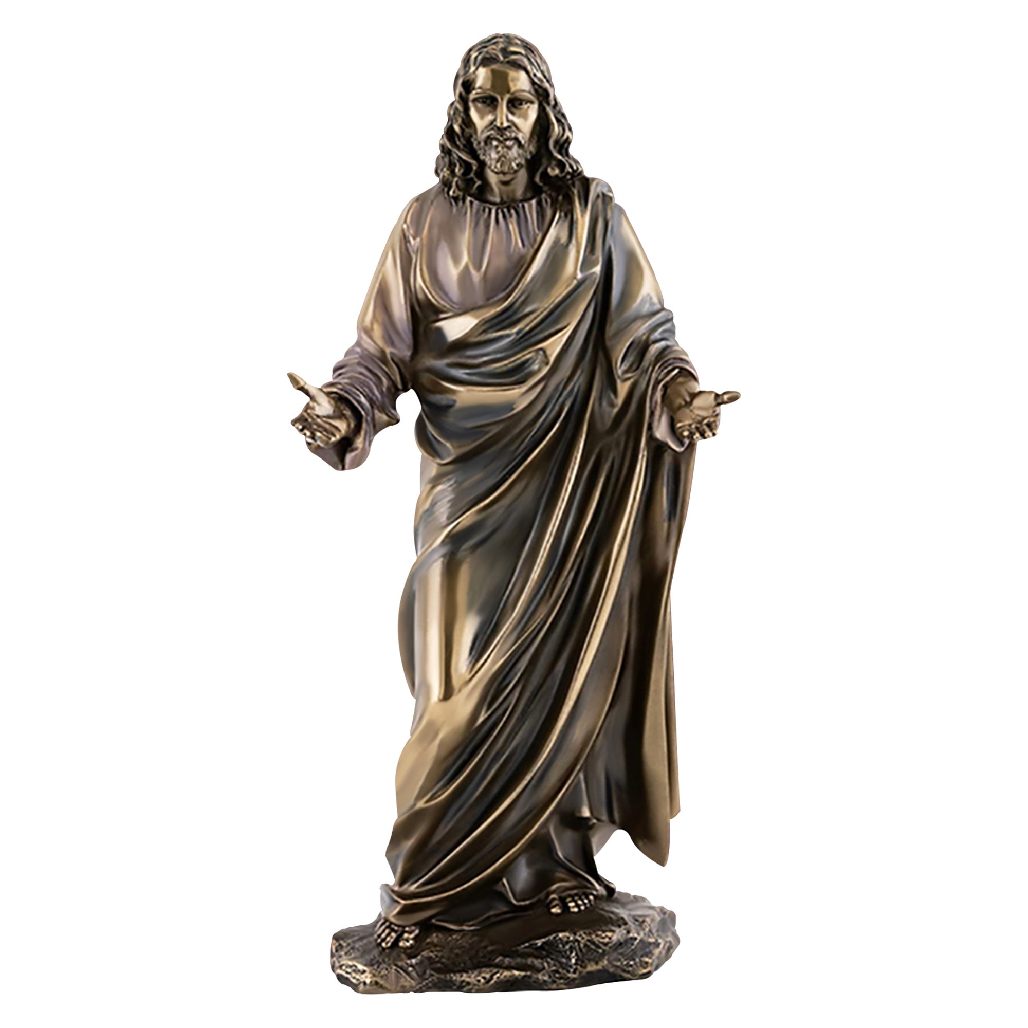 Finished with an antique bronze, this Jesus statue radiates a timeless and sacred beauty that makes it an ideal focal point for any religious or contemplative space. Whether displayed in a church, chapel, religious sanctuary, or even in a private home, this statue serves as a powerful reminder of faith and the enduring love of Christ.