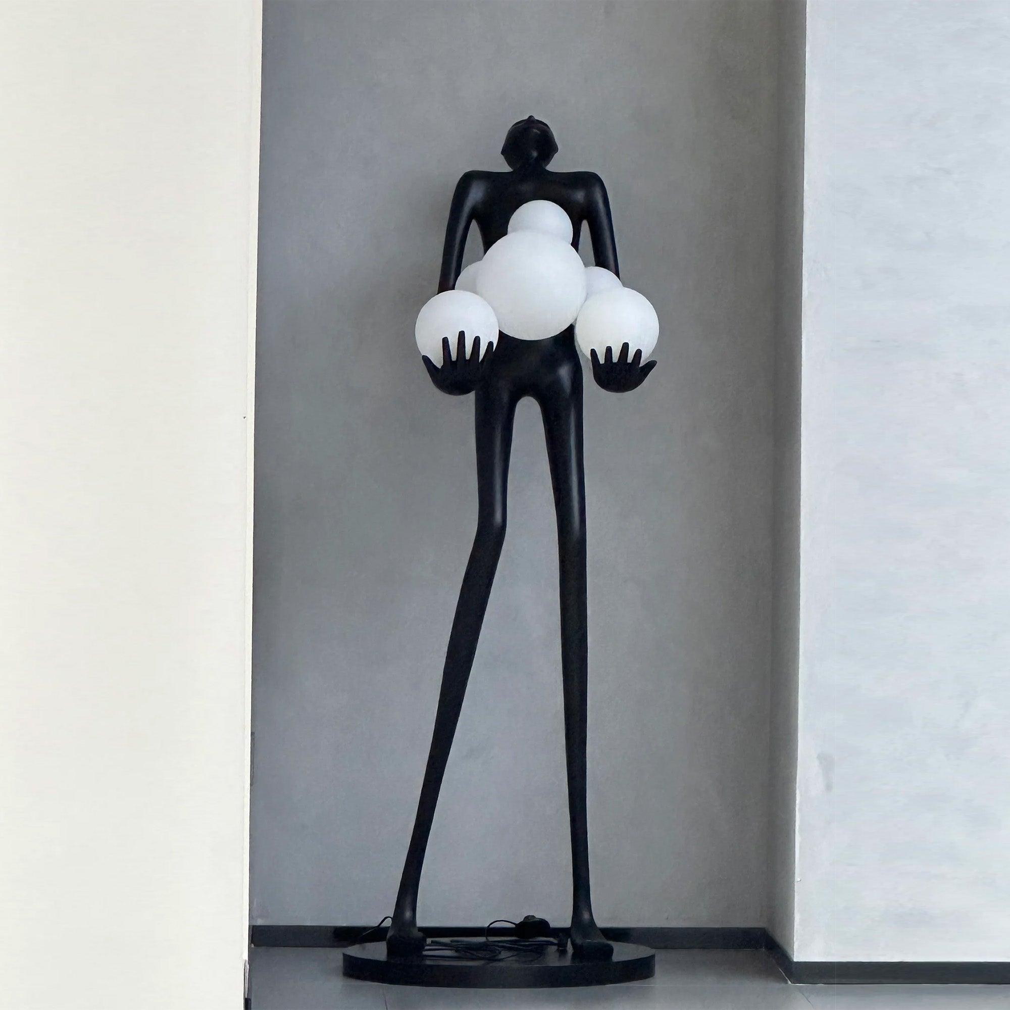 This Modern Abstract Woman Lamp Fiberglass Sculpture is a stunning blend of art and functionality. Featuring an elongated, minimalist female form with an expressive stance, the sculpture holds multiple frosted white globe lights, casting a soft, ambient glow. Crafted from durable resin with a matte black finish, this piece serves as both a striking floor lamp and a sculptural statement. Perfect for contemporary interiors, artful homes, or galleries, this lamp combines modern aesthetics with practicality, making it an ideal centerpiece that enhances the ambiance of any space.