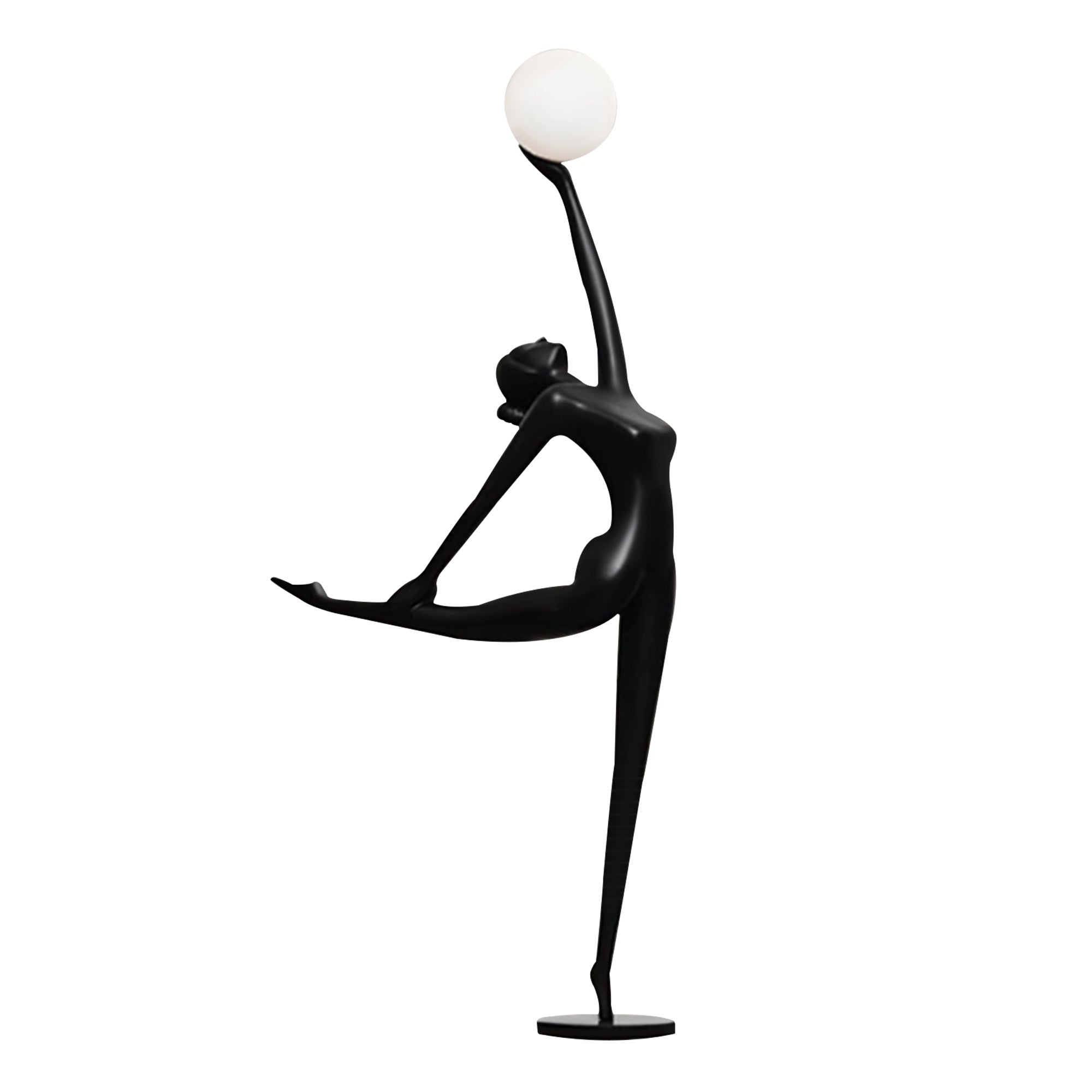 This Custom Black Abstract Human Light Sculpture is an elegant indoor sculpture crafted from high-quality fiberglass, featuring a unique, modern design that doubles as a functional floor light. The figure's graceful pose and the glowing sphere create a beautiful interplay of light and form, making it perfect for enhancing living spaces, lounges, or curated art areas.