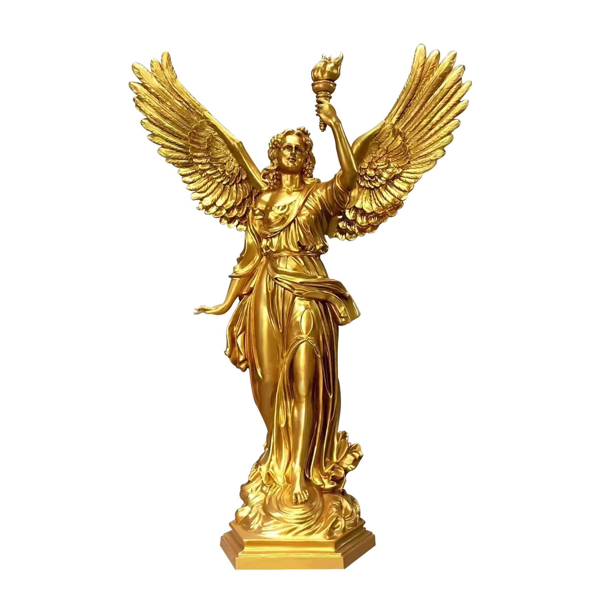 This Life-Size Golden Roman Goddess Angel Fiberglass Statue brings a sense of majesty and reverence to any space. Featuring an angelic figure with outstretched wings and holding a torch, this sculpture symbolizes guidance, light, and spiritual strength. The statue is meticulously crafted from high-quality fiberglass, finished in a radiant gold that enhances its luxurious appearance. Perfect for those seeking a grand statement piece, this statue is ideal for luxurious interiors, art displays, or ceremonial spaces, offering a timeless presence that exudes power and grace.
