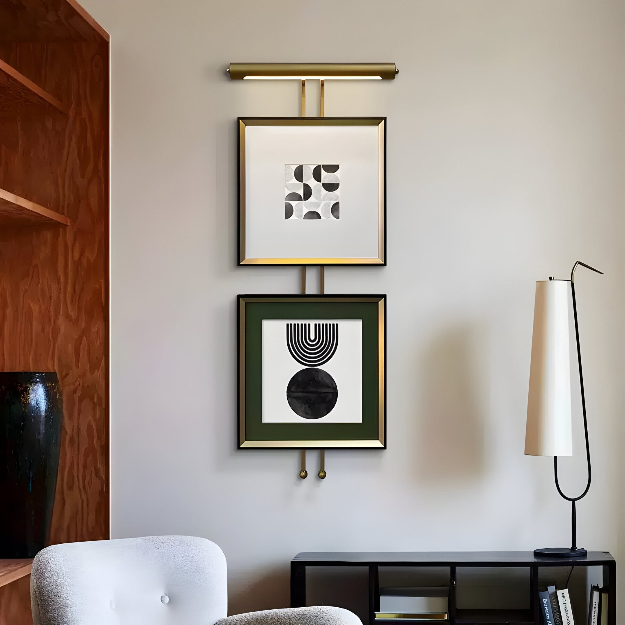 The Artisera Monochrome Symphony Dual Frame Wall Art is a harmonious blend of minimalist design and refined craftsmanship. Featuring two monochromatic designs, the upper frame showcases an abstract composition of black-and-white semi-circles and curves, while the lower frame presents a bold circular motif layered with cascading arcs on a muted green backdrop. Both frames are enclosed in sleek black borders with gold accents, tied together by a vertical gold support and topped with a built-in light. This thoughtful design highlights the artwork’s clean lines and geometric forms, making it a striking addition to modern interiors.