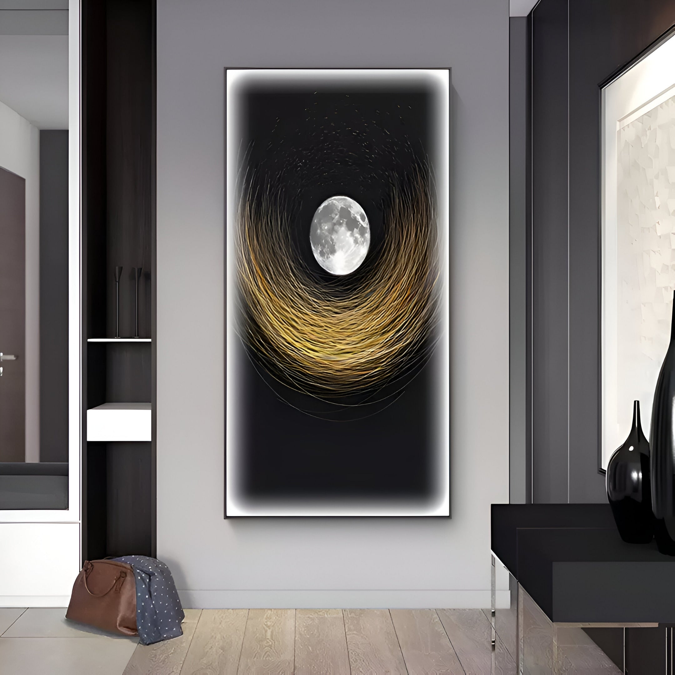 Designed to evoke the calming presence of the moon, this artwork is perfect for creating an inviting atmosphere in living spaces, bedrooms, or modern office environments. The interplay of light and shadow adds depth and intrigue, making it a versatile choice for various decor styles. Engineered for durability and ease of installation, this piece offers flexibility in placement. The LED feature enhances the artwork's celestial glow, while the non-lit version provides an understated charm that resonates with minimalist and contemporary settings.