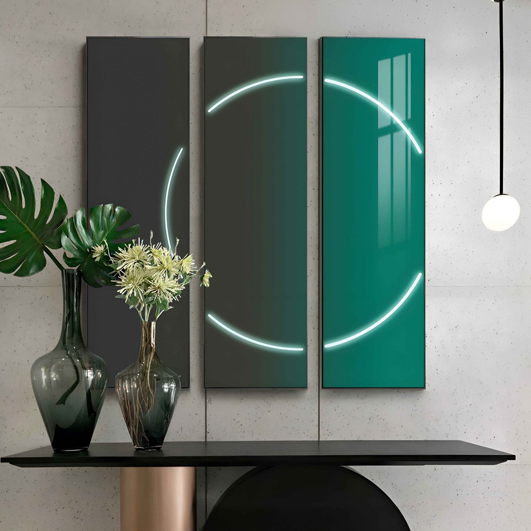 Helios Emerald Crystal Porcelain LED Wall Art brings a sense of refreshing vibrancy to any space. Each of the three panels is crafted from crystal porcelain in a lush emerald hue, reflecting light in subtle, captivating ways. A circular LED element emerges at the center, creating an illuminated ring that accentuates the porcelain’s translucent qualities. The metal frame borders each panel, adding a sleek outline that contrasts with the organic richness of the green color, making this piece a seamless addition to modern or nature-inspired interiors.