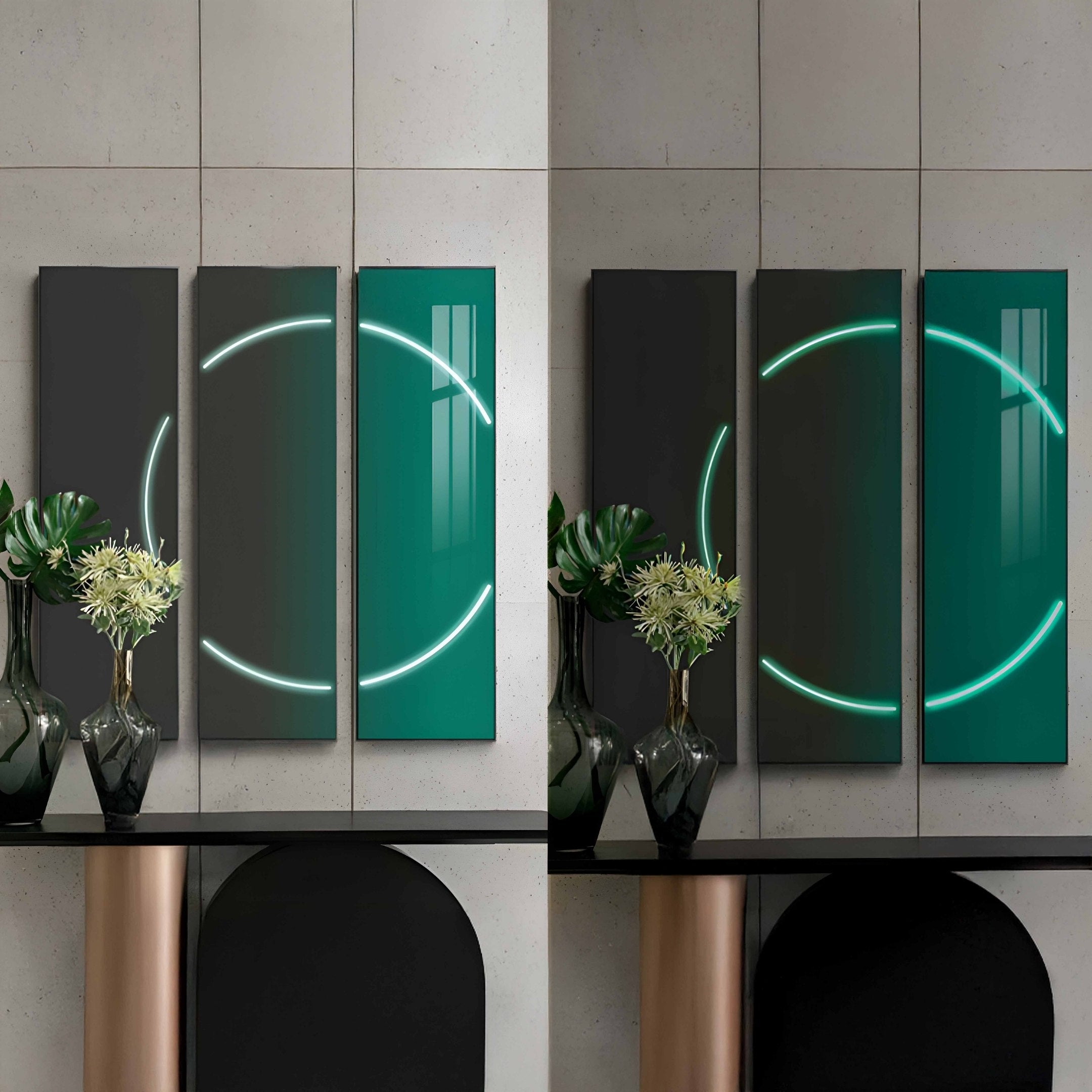 Straightforward to install, the piece arrives with mounting hardware designed for stability and ease. The integrated LED backlighting offers an adjustable glow, letting you tailor the brightness to suit different moods or occasions. Under brighter settings, the emerald hue appears vivid and dynamic, while dimmer light reveals softer, more soothing tones. This versatility allows Helios Emerald to thrive in living rooms, stylish cafes, or tranquil office spaces. Thanks to the combination of refined materials and advanced lighting, the wall art remains a showstopper at any hour. By merging contemporary design with a nature-inspired color palette, Helios Emerald delivers a serene yet captivating presence.
