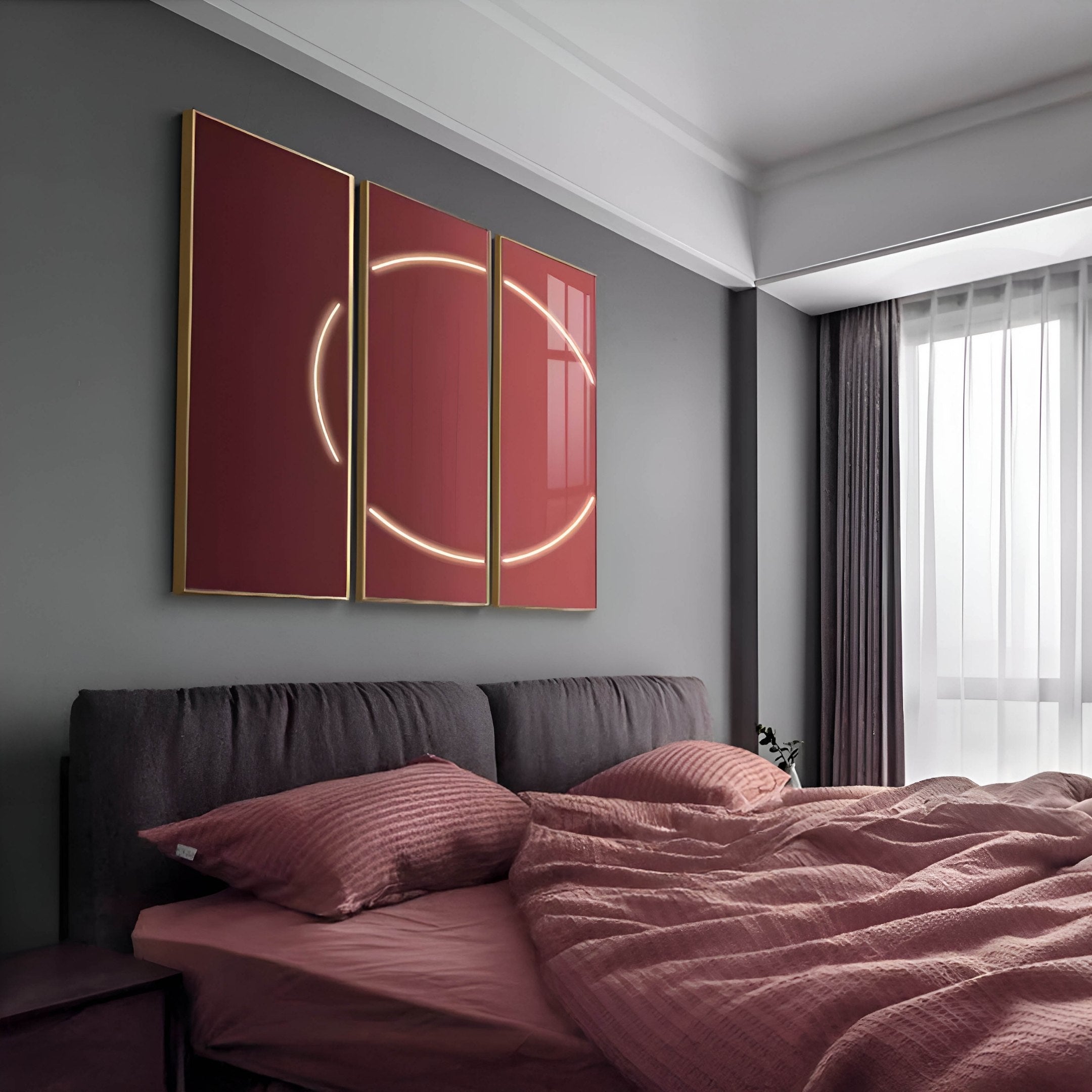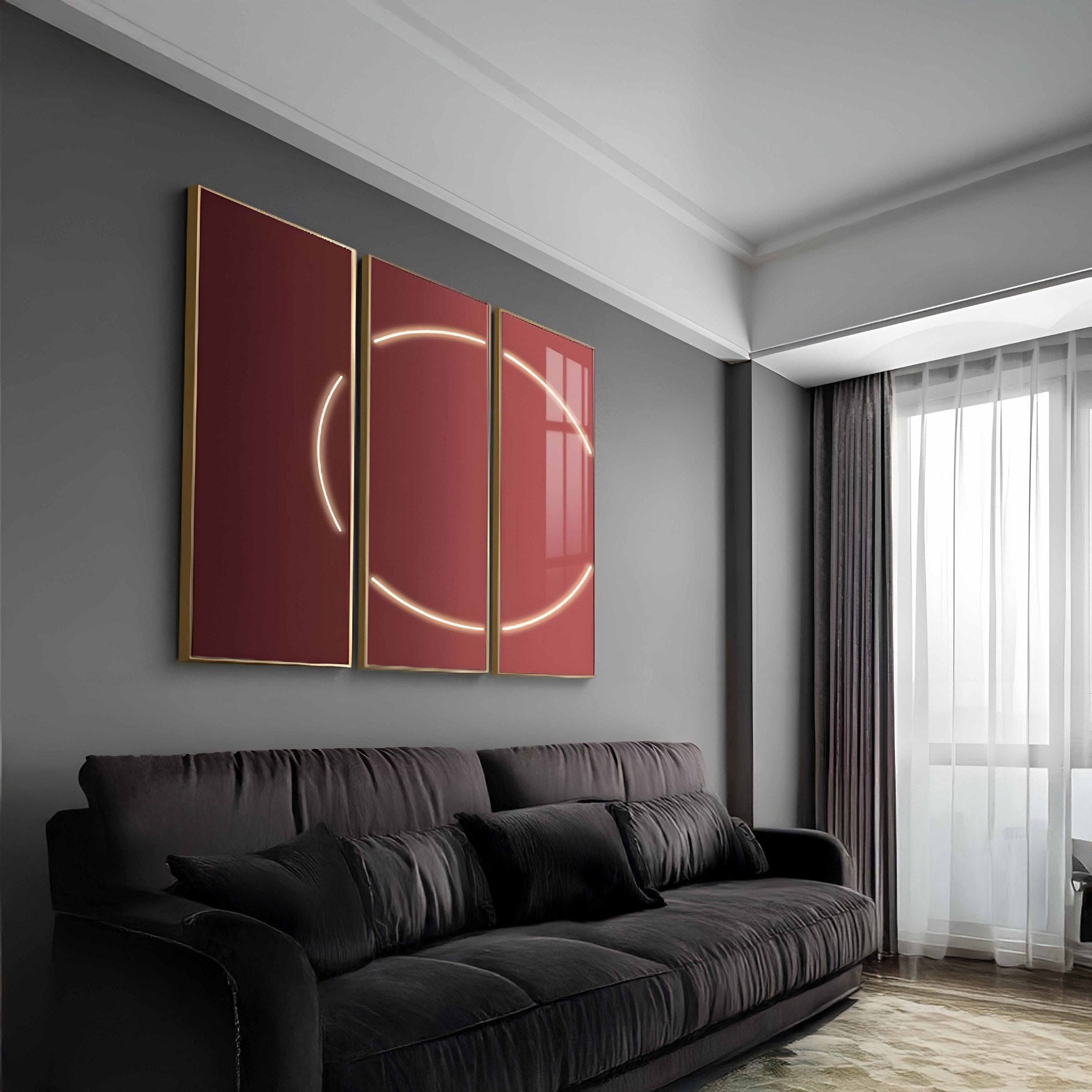 Helios Ruby Crystal Porcelain LED Wall Art commands attention with its vivid, red-toned panels that exude passion and warmth. Each of the three crystal porcelain panels highlights the depth and complexity of a ruby shade, catching the light in subtle yet alluring ways. At the center, a circular LED element glows through the porcelain, creating an illusion of a softly illuminated ring that captures the eye. A metal frame borders each panel, ensuring long-term durability while offering a crisp outline that complements contemporary design schemes.