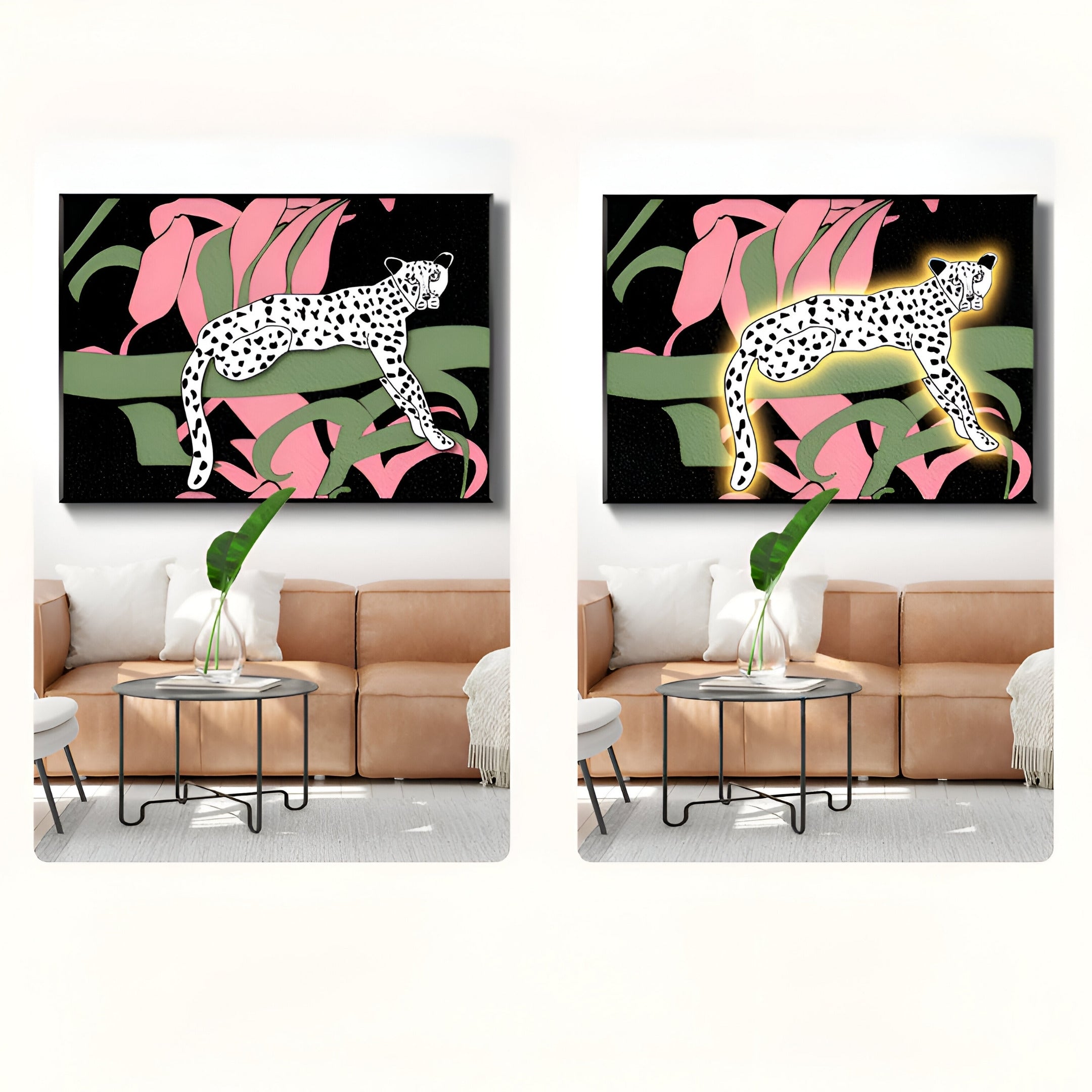 Juniper I Botanical Escape Sandstone Wood Carving 3D LED Wall Art is a breathtaking display of natural inspiration and expert craftsmanship. This one-of-a-kind piece combines intricately carved botanical patterns with vibrant floral elements, all set against a backdrop of sandstone and wood textures. The bold inclusion of a dynamic cheetah motif adds energy and character, making it a standout centerpiece for any space. The three-dimensional carvings create depth and detail, while integrated LED lighting illuminates the artwork, bringing the colors and textures to life with a warm, inviting glow. This combination of natural materials and modern technology makes it ideal for those seeking to bring a sophisticated and organic ambiance into their home or workspace.