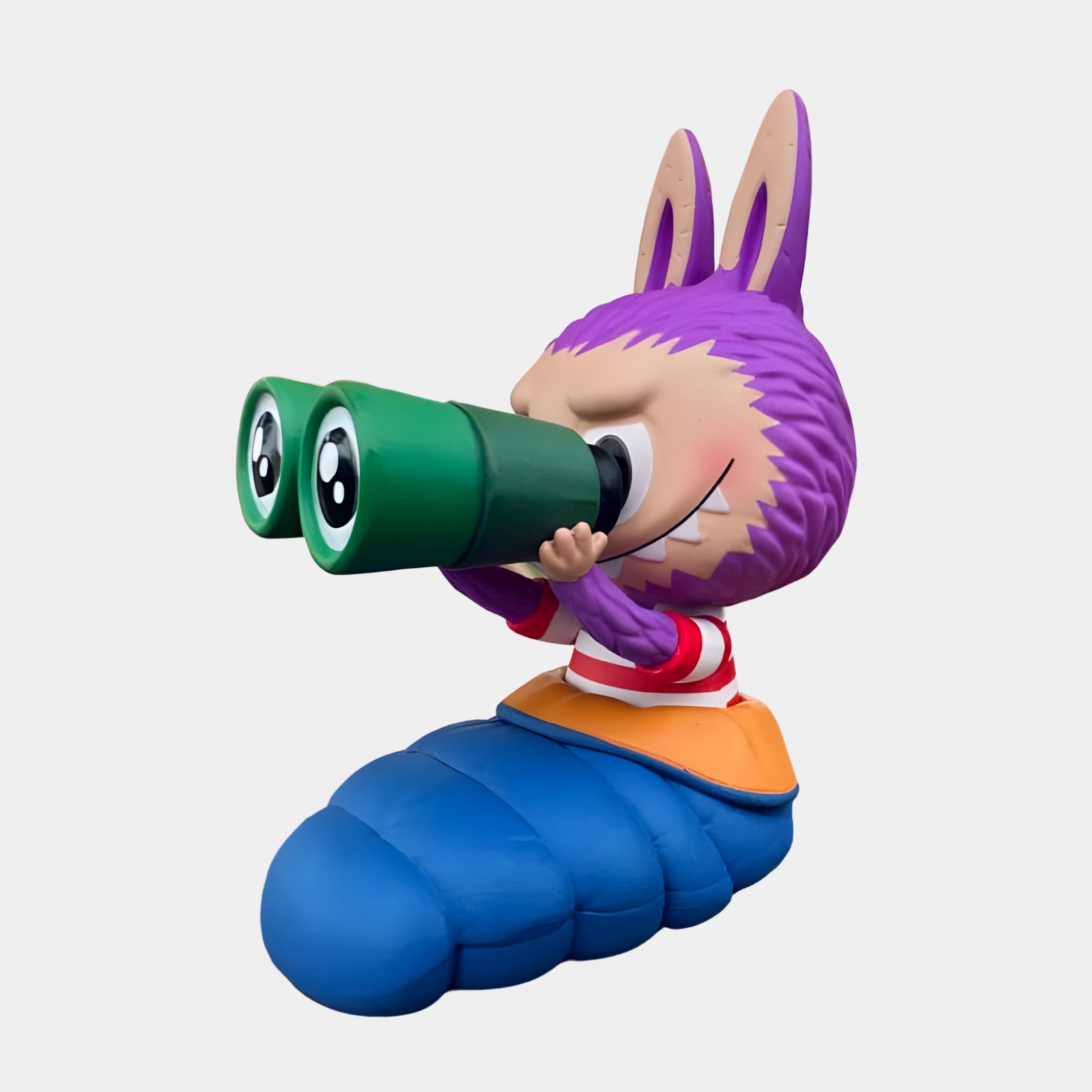 The Camp Life Lookout Labubu Sculpture 100cm captures a playful moment of outdoor curiosity through a colourful, compact fibreglass figure made for indoor display. Labubu is nestled in a padded sleeping bag rendered in vibrant blue and orange, with arms raised to hold oversized green binoculars in front of its wide, expressive eyes. The purple fur, red-and-white striped shirt, and cheeky grin add energy and warmth to the scene. Sitting upright and alert, this version of Labubu appears fully engaged, eyes fixed through the lenses as if scanning for wildlife, friends, or adventure ahead. The sculpted binoculars exaggerate the moment in classic Labubu fashion, adding both whimsy and a sense of narrative. Every detail from the bag’s quilted surface to Labubu’s attentive pose invites the viewer to join in the lookout.