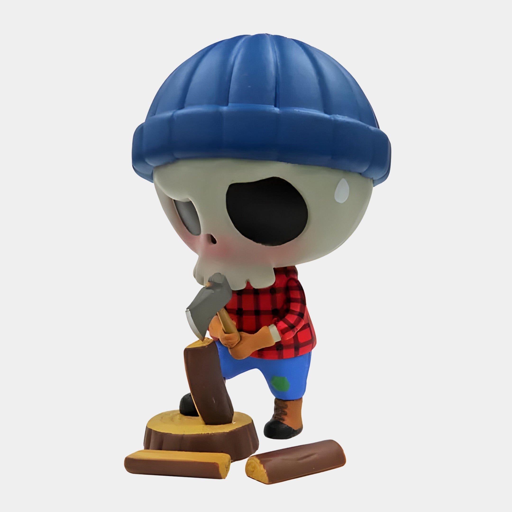 The Camp Life Lumberjack Skull Labubu Sculpture 100cm delivers a quirky, wood-chopping scene straight into your indoor space with bold character and crisp detail. Made entirely of fibreglass, this sculpture features Labubu in its skull form, fully immersed in a lumberjack role. Wearing a red plaid shirt, blue beanie, distressed blue trousers, and rugged brown boots, Skull Labubu is mid-swing with an axe, surrounded by chopped timber on a log base. Its large hollow black eyes and soft blush around the cheekbones add personality to its skeletal head, while a small sweat drop hints at comic exertion. The axe is locked into a vertical log, giving the piece a freeze-frame action feel. The clean sculpting and vibrant colours give it a standout visual punch, while the matte fibreglass finish enhances its modern edge.