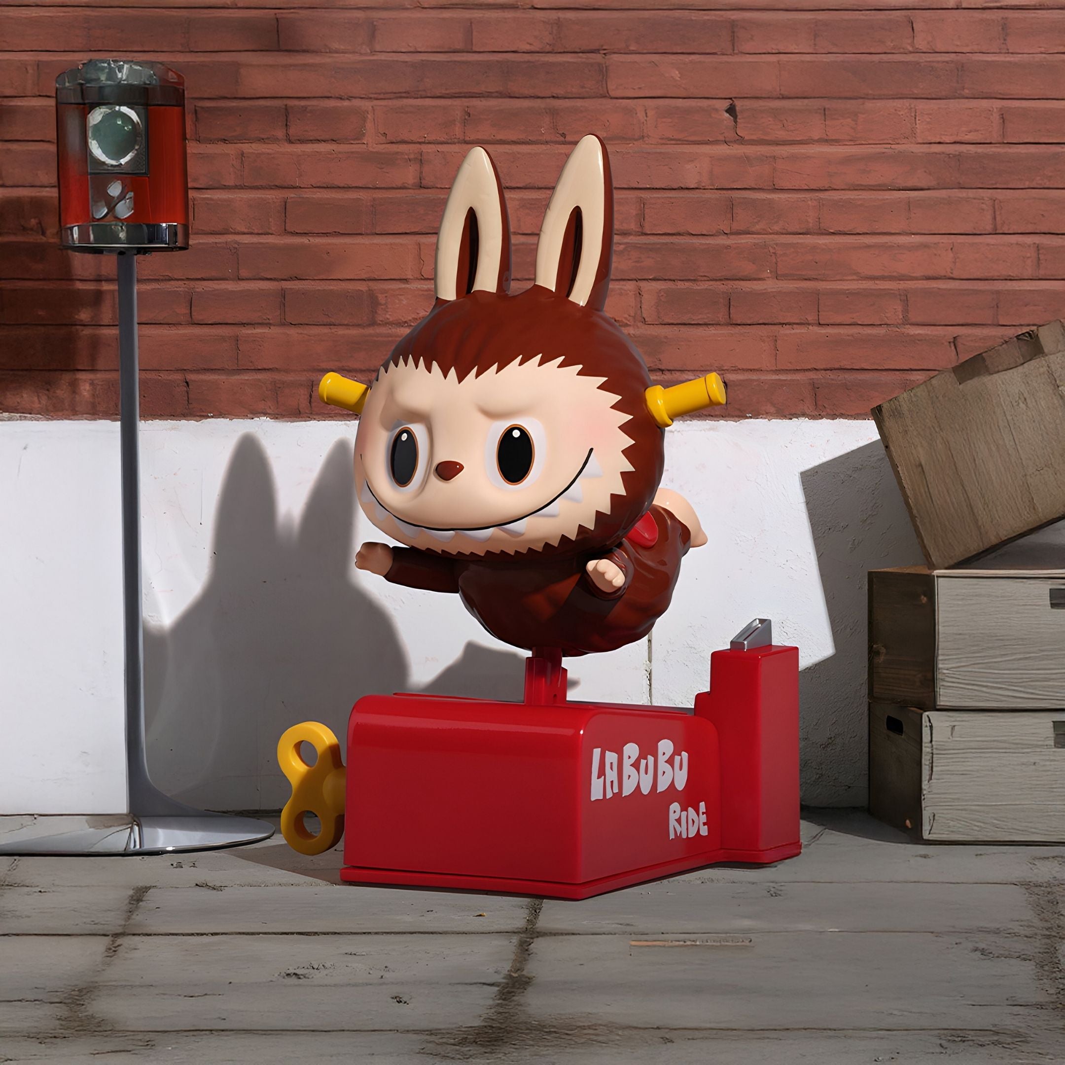 The Hidden Kiddie Ride Labubu Sculpture presents Labubu poised atop a bright red ride-on base, complete with wind-up key and handlebar grips. Crafted from durable fibreglass, the figure features glossy brown fur texture, cream-toned ears and a cheery expression with wide grey eyes and subtle blush. The ride mechanism is sculpted in bold red with “Labubu Ride” lettering, while the base sits on discreet black rubber feet to protect surfaces. Attention to detail, from the gently curved handlebars to the smooth, rounded contours of Labubu’s form, creates a playful yet refined art piece that captures the nostalgia of childhood amusement.
