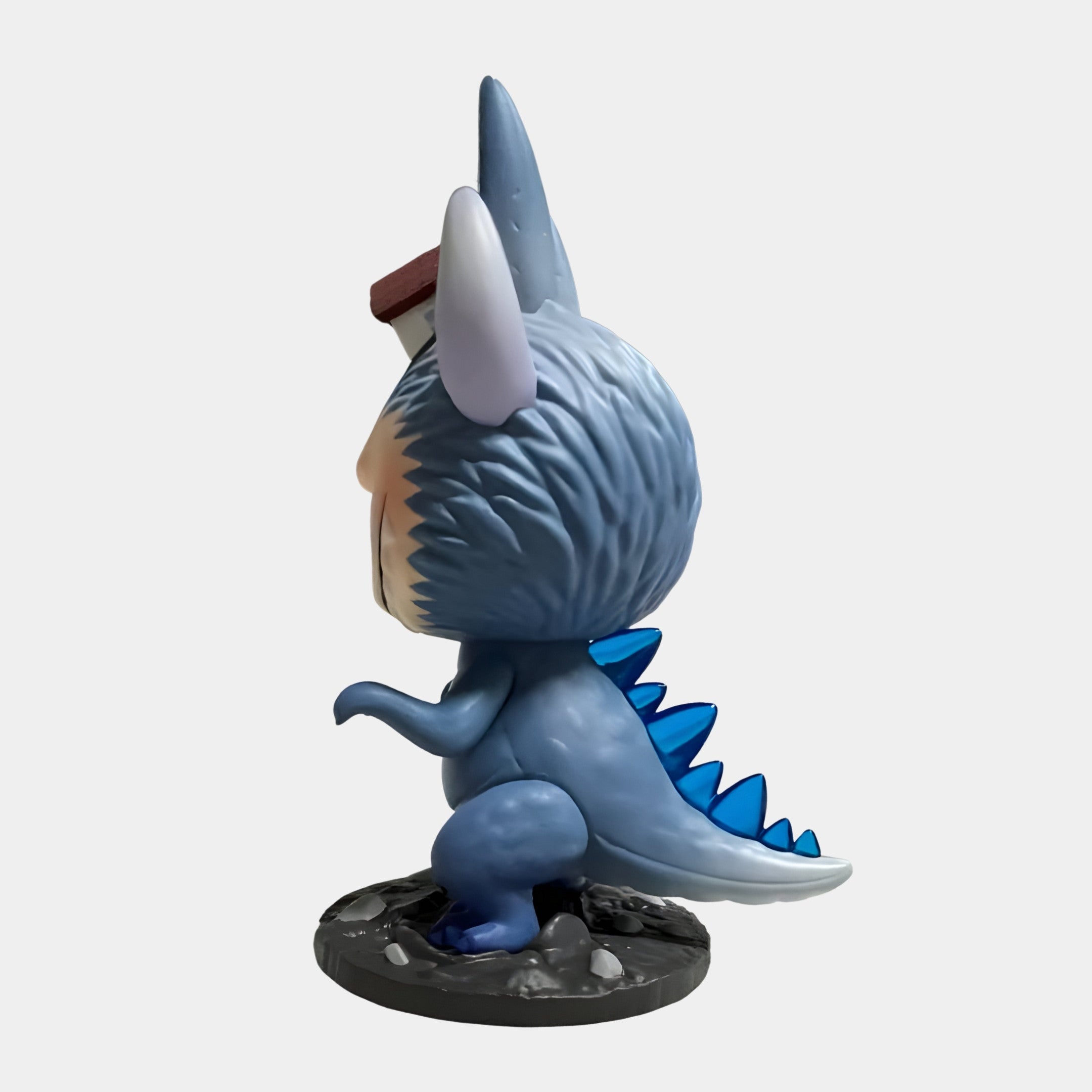 The Monsterverse Spiral Beast Labubu Sculpture 100cm reimagines Labubu as a wide-eyed monster with kaiju energy and playful detail. This fibreglass piece captures the character mid-stomp, complete with a swirling hypnotic gaze, sharp toothy smile, and textured blue-grey fur. Standing on a cracked urban-style base, Labubu’s tail is lined with bold blue spikes that run from spine to tip, giving it classic monster silhouette appeal. The highlight? A tiny brown house wedged right on top of its head, suggesting it’s emerged from below or caused destruction just moments earlier. The large round belly and crouched pose enhance the sculpture’s balance, making it appear ready to pounce, or keep on causing mischief.