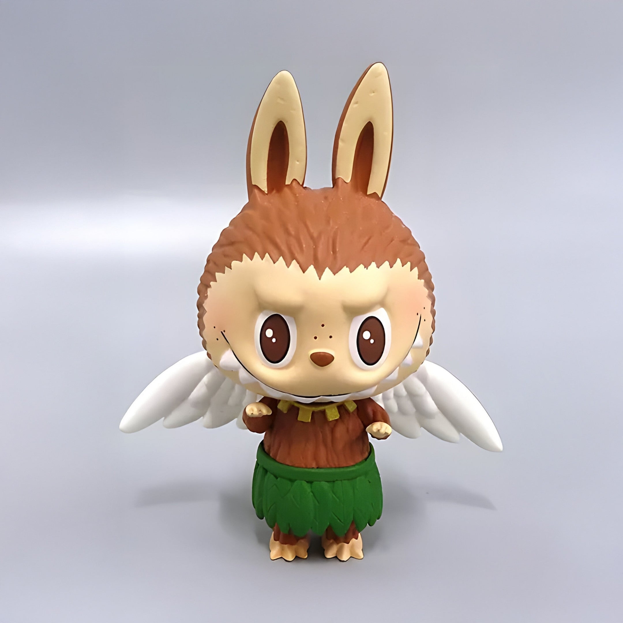 Standing 100 cm tall, the Space Adventures Zimomo Beast Labubu Sculpture blends forest mystique with Labubu’s playful character design. Cast in fibreglass, the hollow body keeps the figure substantial yet easy to position. Textured russet ‘fur’ crowns the head and flows into tall cream ears that frame an apricot face. Wide hazel eyes, freckles and a subtle grin of pointed teeth give it alert charm, while a gold-tone collar of geometric charms adds a hint of tribal fantasy. Feathered white wings sweep from the shoulders, contrasting the bark-like torso and leaf-green skirt. Clawed feet anchor the figure firmly atop a discreet plinth, and a satin top-coat intensifies colour depth. Each surface is hand-painted and inspected for uniform texture and a museum-grade finish, ensuring collectors receive a dependable centrepiece.