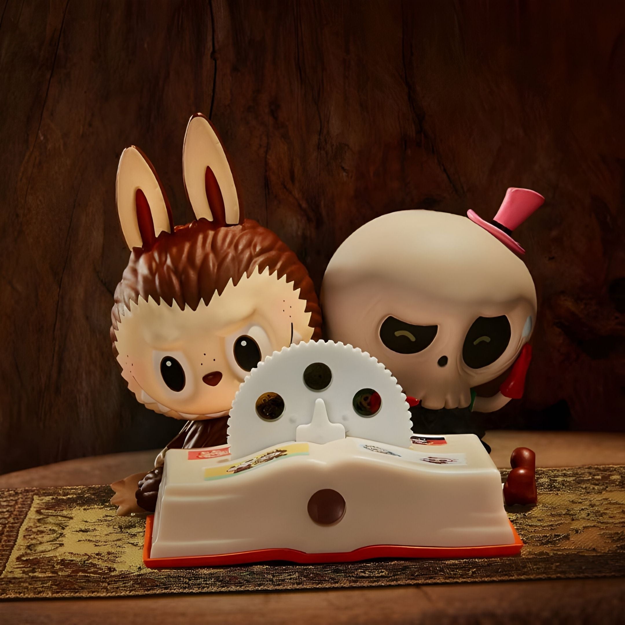 The Spooky Buddies Blade Trick Labubu Sculpture 100cm serves up a scene that’s equal parts playful and unnerving. Crafted in fibreglass, this piece features Labubu with a wide-eyed grin, crouched beside a skeleton companion who looks less than thrilled. Between them sits a suspicious “cake” with a surprise inside, a jagged saw blade replacing what should’ve been sweet filling. Labubu’s curious expression contrasts with the skeleton’s classic look of dread, complete with a sweat droplet and red glove raised to its cheek. The moment is captured in sculpted detail, from Labubu’s textured brown fur and upright ears to the skeleton’s tilted pink top hat and black tunic. The saw itself is gleaming white, its teeth exaggerated for cartoon drama. The combination of childlike design and unexpected tension gives the piece its narrative punch.