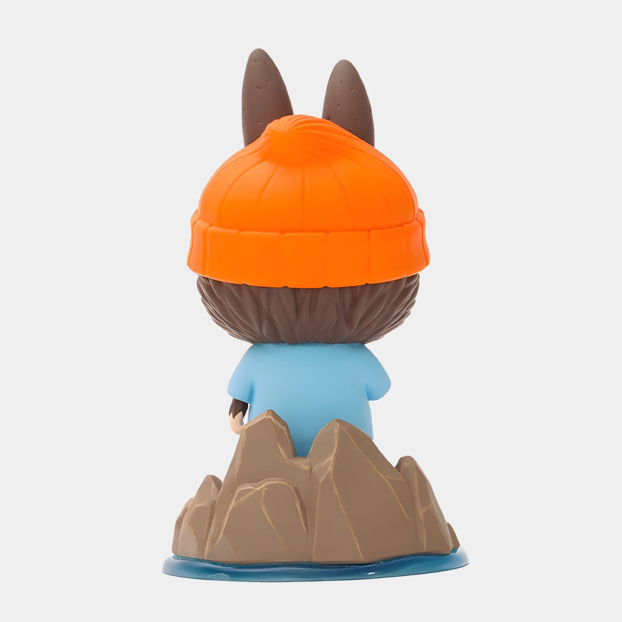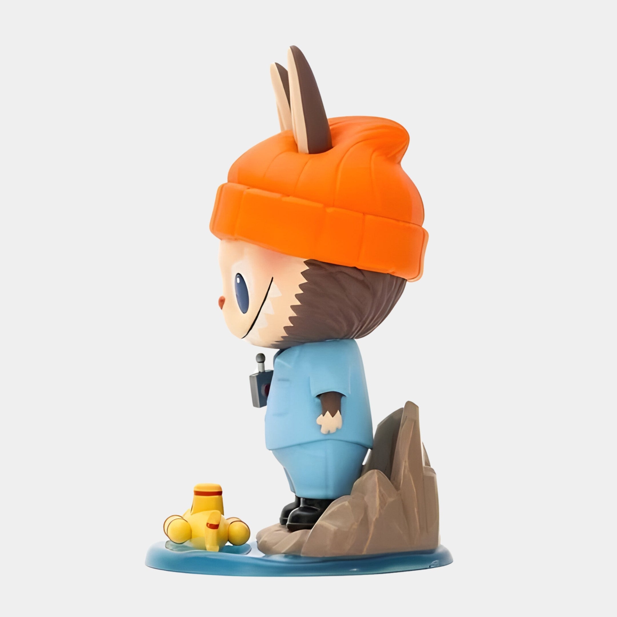 The Submarine Explorer Labubu Sculpture 160cm reimagines deep-sea adventure through a character-driven design bursting with colour and charm. This large fibreglass figure features Labubu dressed in a light blue explorer's outfit with black boots, holding a radio in hand, and standing confidently on a sculpted rocky base surrounded by water. A playful red and yellow submarine rests at its feet, giving context to the underwater expedition. Labubu’s oversized orange beanie and alert wide-eyed stare add personality to the composition, while its red button nose and signature ear shape retain the familiar Labubu identity. The scene is fully formed, from the jagged rocks to the rippling water texture, resulting in a narrative sculpture with storytelling baked into every detail.