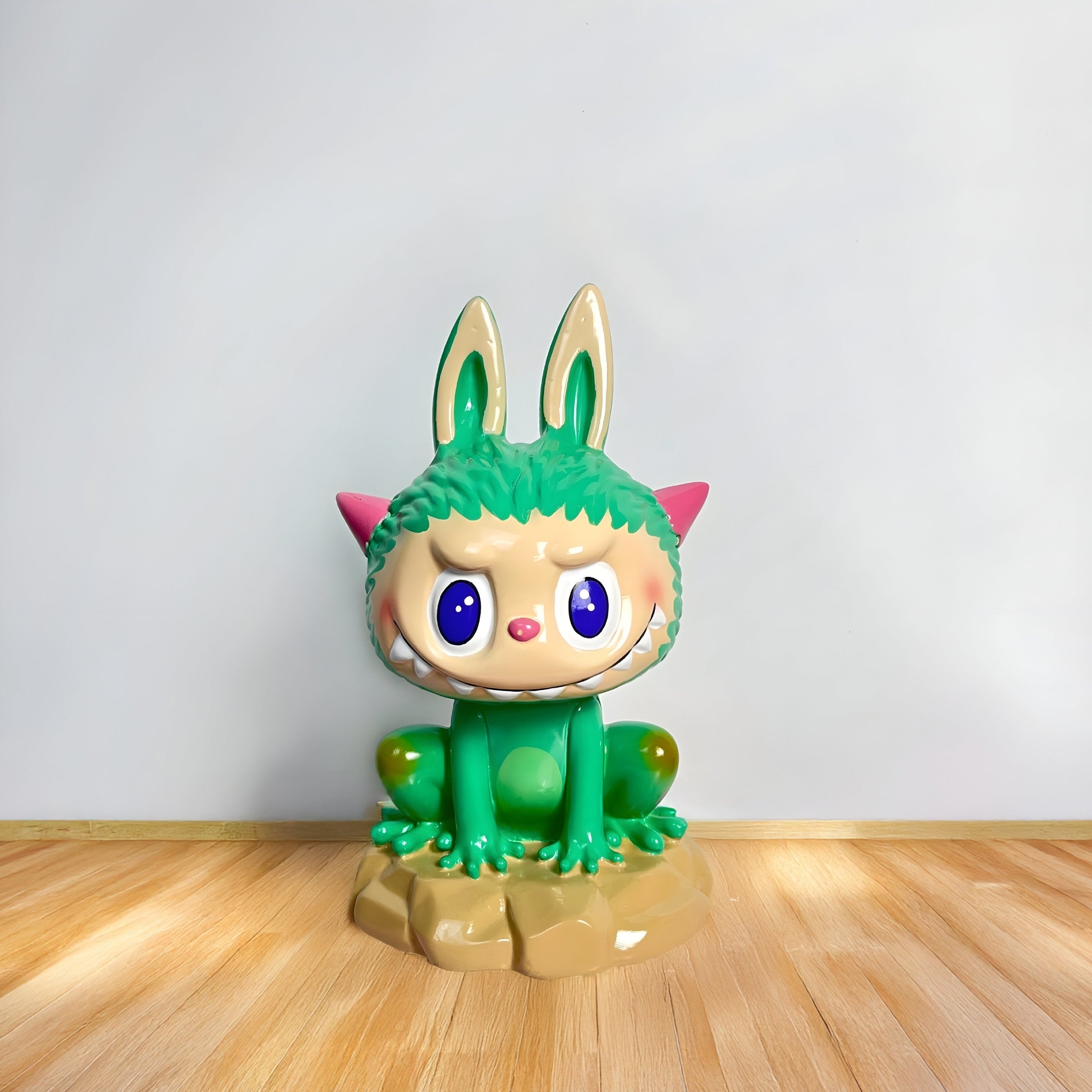 The Monster Frog Alien Labubu Sculpture - 100cm packs cosmic personality into a compact footprint. Cast in fibreglass, the hollow form holds its stance without feeling bulky. Emerald-green “fur” crowns the head and tapers into tall, cream-tipped antenna-ears, while pink side-ears add a flash of colour. The apricot face frames outsized cobalt eyes with twin highlights, a rosy nose and an impish, tooth-lined grin. Limbs crouch frog-like on a moulded sandstone base, giving the figure a ready-to-pounce energy. Gradient greens, deep at the shoulders, lighter at the chest, hint at alien bioluminescence, and each clawed toe is individually sculpted. A high-gloss clear coat seals the hand-painted layers, delivering mirror depth that pops under gallery lighting. Every piece passes stringent texture and colour checks, creating a museum-grade finish fit for high-end interiors.