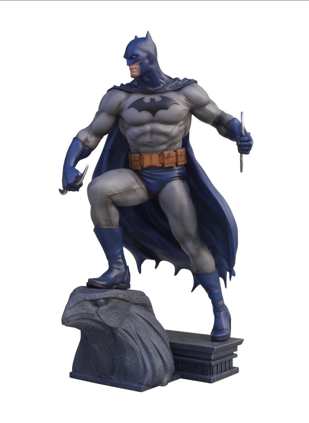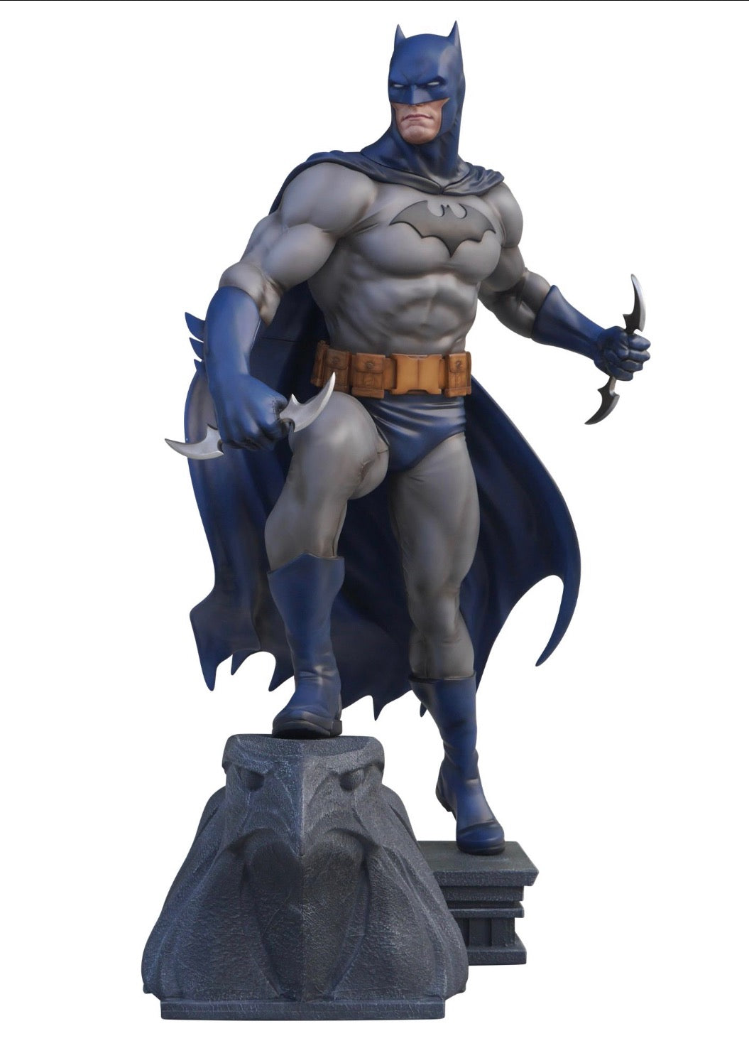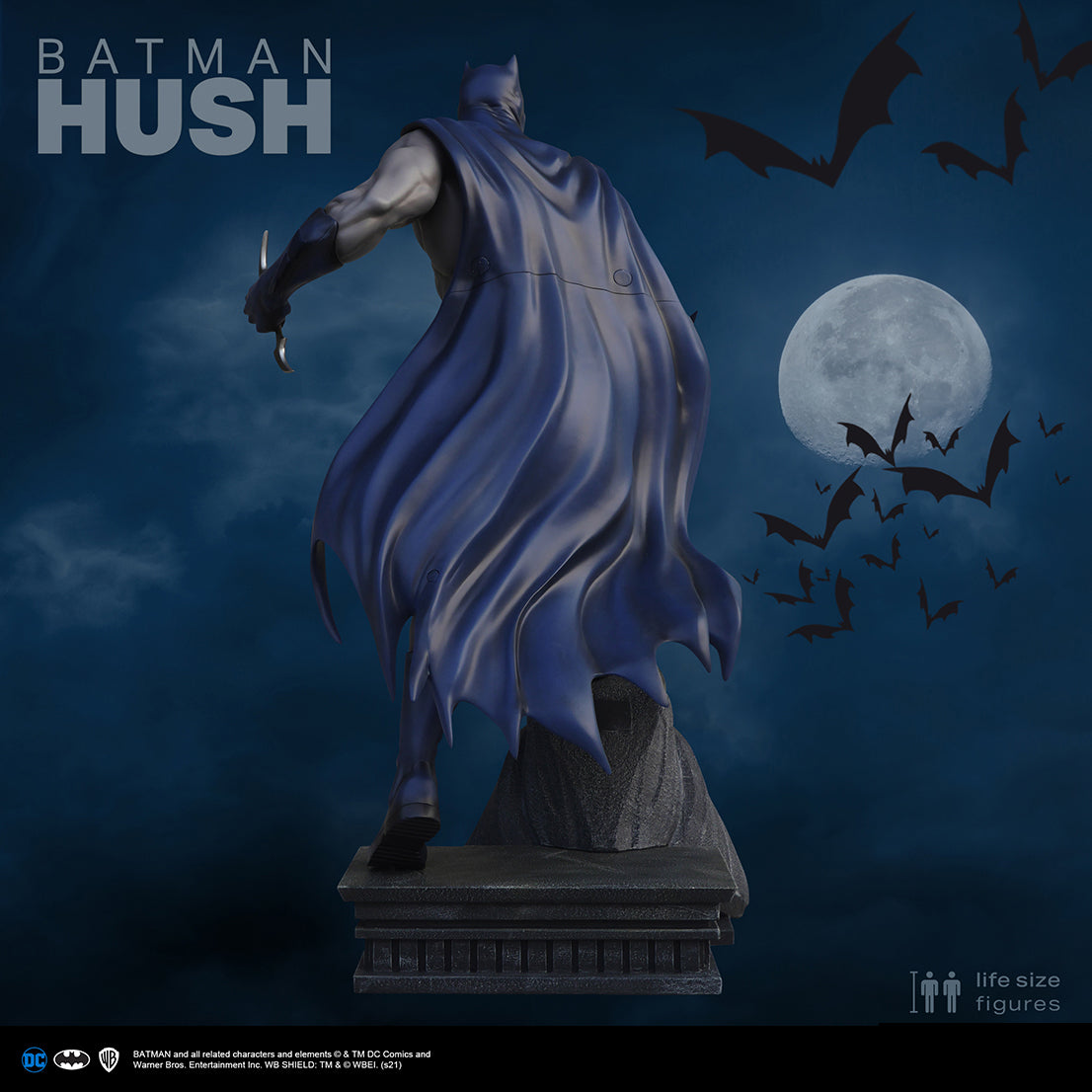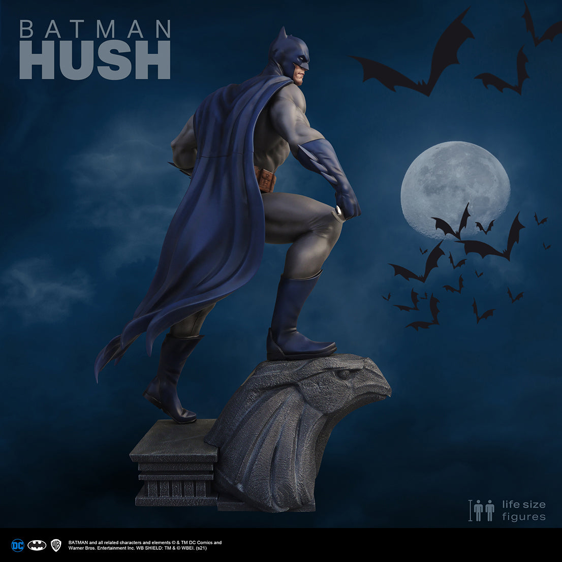 From the brilliant 2002 fan-favorite BATMAN: HUSH comic book series, written by Jeph Loeb and pencilled by the legendary Jim Lee, which was followed by the?animated film adaptation in 2019,?comes this life-size statue of The Dark Knight. Cast in fiberglass and towering on a Gotham City gargoyle base, ready to strike?with 2 Bat-A-Rangs?in his hands, Batman's cape is flowing, as he is sternly looking focused on the battle ahead.?