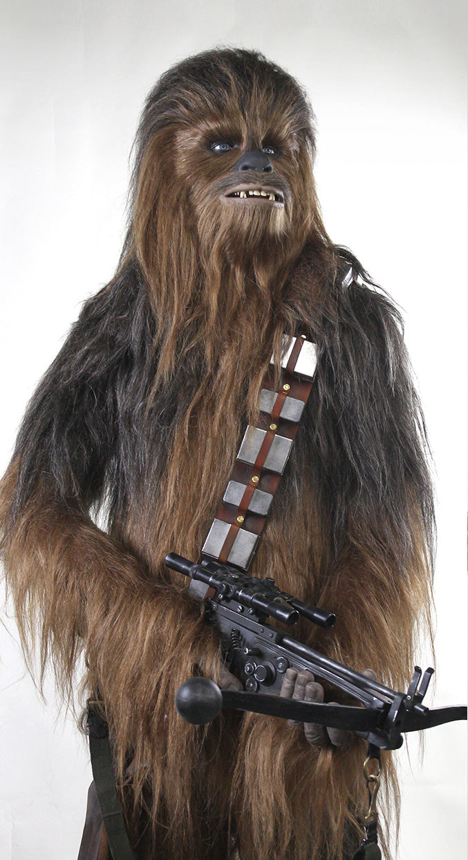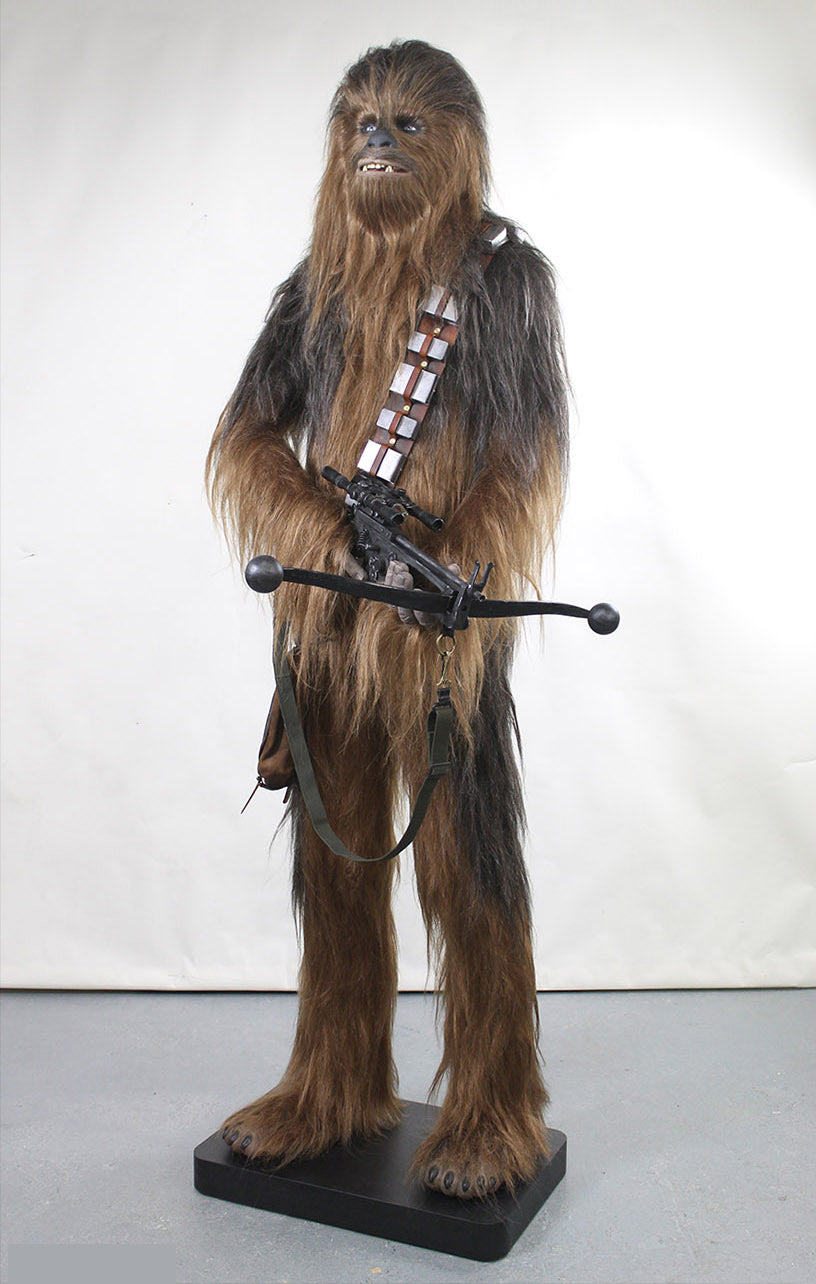 This highly detailed life sized Wookiee figure and bowcaster replica are made from fiberglass and resin, and features silicone fingers, custom acrylic prosthetic eyes and translucent resin teeth with a silicone tongue. The hand-built metal and leather bandolier and heavily distressed pouch complete the look of this massive, 1:1 statue!?