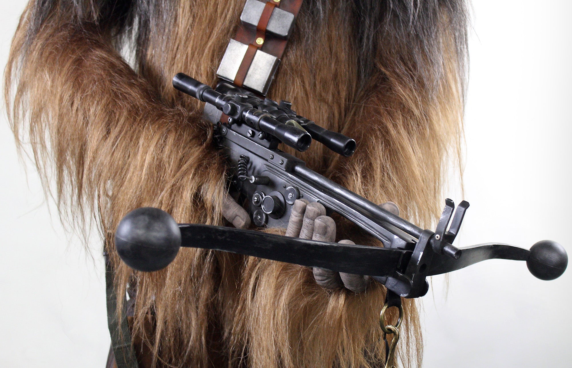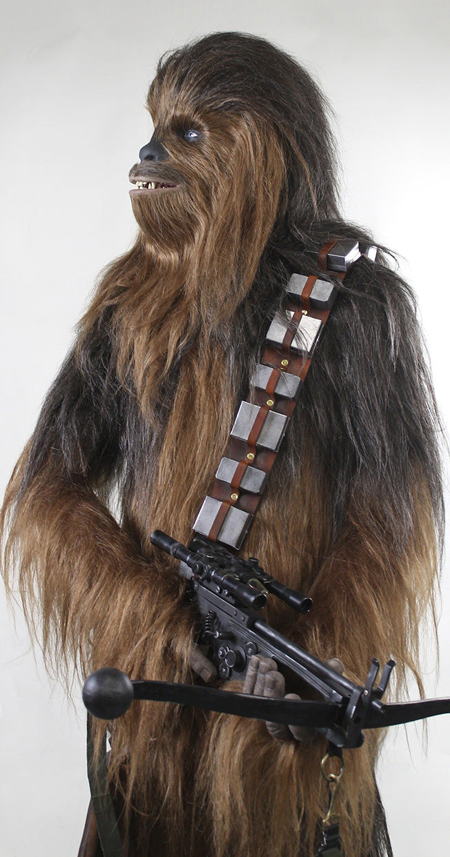 - hand-crafted and distressed leather and metal bandolier and resin bowcaster replica