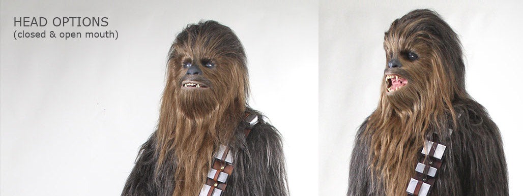 The head is poseable, allowing for tilting left to right, leaning front to back and turning for the ultimate in that classic “Chewie” character!? The head is hand painted prior to hand-glued FX style hair, applied a little at a time, just like the original maker, Stuart Freeborn, did on the original movie masks for the films. Clients will be given their choice of either open mouth or more closed-mouth head.?