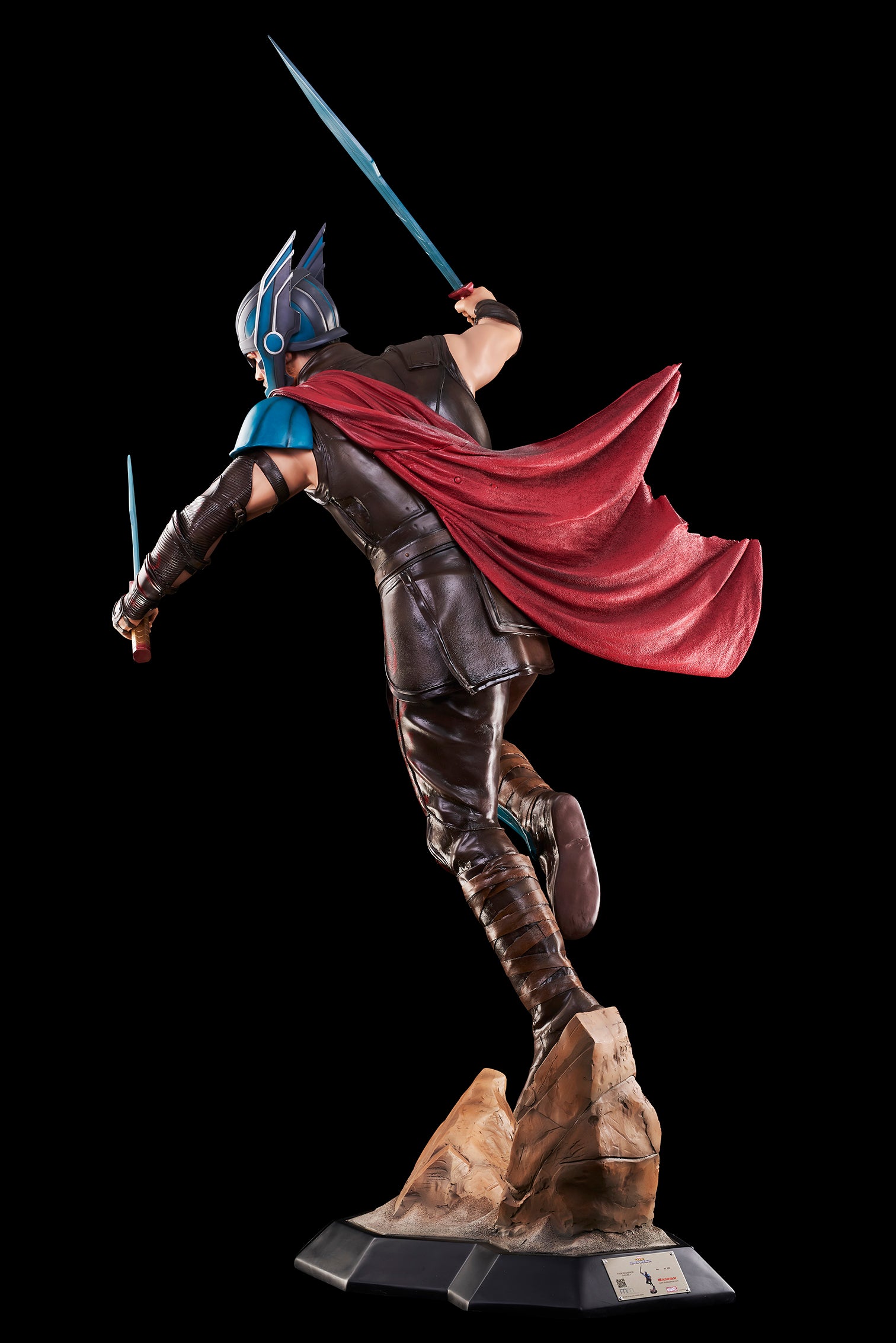 One of the most surprising reinventions within the Marvel Cinematic Universe was the latest installment in the THOR saga. Infused with Taika Waititi’s zany humor and a fresh & bright color palette, previously not seen in any of the Norse God’s adventures, “Thor Ragnarok” is a highly entertaining gem and clever reinvention of the genre. To avoid treading on all-too familiar terrain, Thor was also given a brand-new look - and attitude - both of which were wholeheartedly embraced by the fans. Memorializing the vastly popular arena gladiatorial scene (in which Thor battles his friend, the HULK), our new action-posed THOR statue, made from fiberglass, comes complete with his gladiator outfit, including his new helmet, 2 swords and its own custom base, which also incorporates the film’s logo.