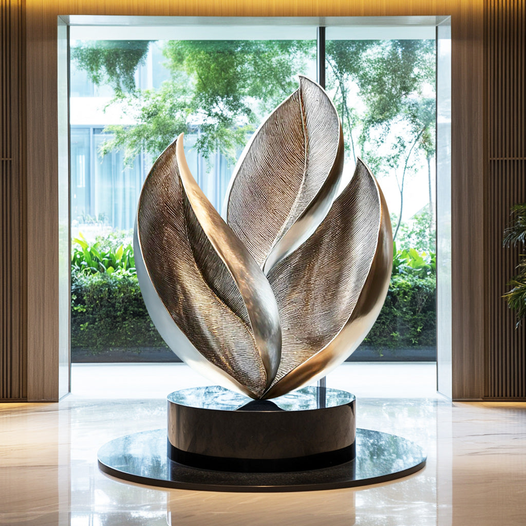 This Custom Abstract Leaf-Inspired Stainless Steel Indoor Sculpture with Black Base captures the elegance of nature through its organic leaf forms, beautifully twisted into a dynamic abstract shape. The brushed and polished finish adds depth, texture, and shine to this abstract sculpture, creating a sophisticated contrast. Paired with a sleek black base, this stainless steel sculpture brings a refined and modern touch to any space. Perfect for luxury interiors, corporate offices, or art galleries, it blends nature’s beauty with contemporary design in a striking and captivating form.